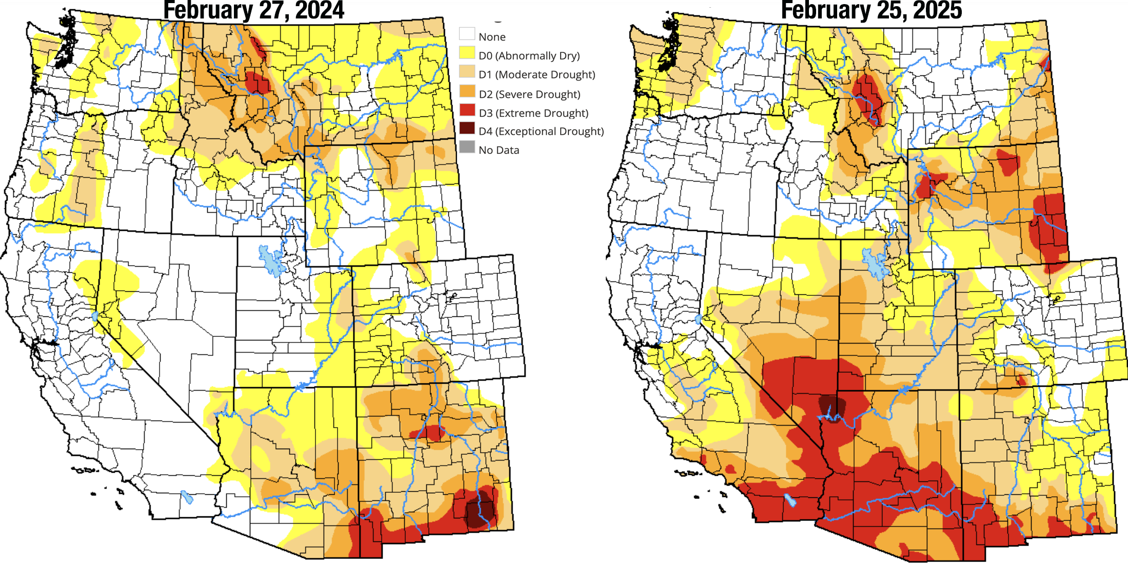 Grand Junction’s average maximum temperature in February was 55° F, nearly nine degrees warmer than the 1991-2020 normal. Phoenix recorded its hottest February on record, and the high reached 90° F on Feb. 24 (the earliest on record was on Feb. 17, 2016). Phoenix has received just .02” of precipitation since Aug. 22.