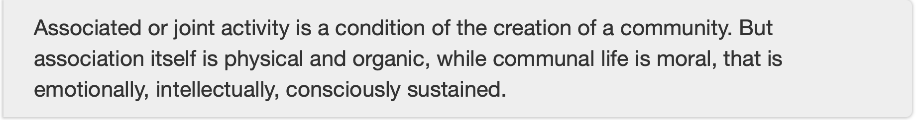 Dewey’s 1927 book lays out an argument that I find appealing in this fraught moment: that what we mean by “democracy” is not a structure of government, with voting and stuff, but rather a way of being in community: