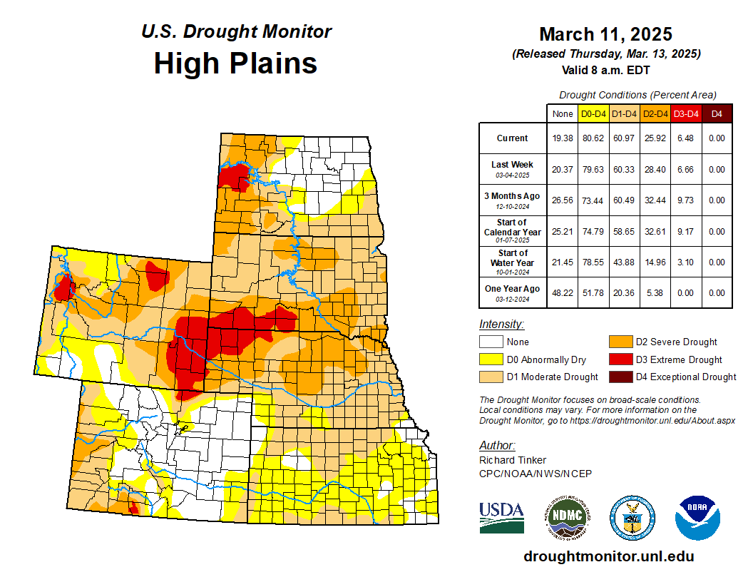 Light to moderate precipitation fell on parts of the High Plains Region last week, reducing dryness and drought severity in the middle of the Region across several patches in Wyoming, adjacent northern Colorado, part of north-central Nebraska, and a small area in northwestern Kansas and adjacent areas. Farther south, continued subnormal precipitation induced a broad area of deterioration in central and western Kansas and smaller portions of southern Colorado, but heavier amounts eased conditions in eastern Kansas. The depiction across the Dakotas did not change. During the last 90 days, less than half of normal precipitation was measured across south-central and southwestern Kansas, southeastern Colorado, and a few patches across the Dakotas. At the same time, much of Wyoming, central and northeastern Colorado, and a few swaths from northern Kansas through Nebraska and southwestern South Dakota recorded above-normal amounts. Southwestern Kansas and southeastern Colorado were particularly dry during the last 90 days, receiving less than 25 percent of normal…