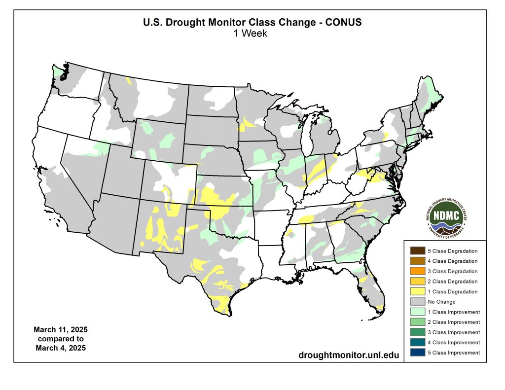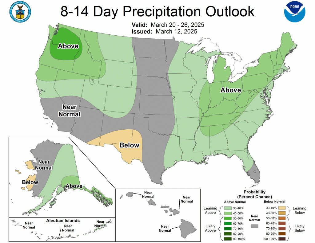 The Climate Prediction Center’s 6-10 day outlook valid March 18-22, 2025 favors a continuation of below-normal temperatures from the Rockies westward, and warmer than normal weather over most of the central and eastern states. Odds for unusual warmth top 60 percent from the Ohio Valley and mid-Atlantic northward to the Canadian border while there is over a 70 percent chance of unusually cool conditions in the western Great Basin. Hawaii has significantly enhanced odds for above-normal temperatures (over 60 percent), and the dry areas of southern Alaska should also average warmer than normal, although with lower probabilities. Meanwhile, subnormal precipitation continues to be favored across most of Texas and Oklahoma, and there are slightly enhanced chances for drier than normal weather over part of North Dakota and along the South Atlantic Seaboard. The rest of the country should average near- or wetter-than-normal, with the best odds for surplus precipitation over and near the Pacific Northwest. Above-normal precipitation is also favored for the western half of Hawaii and for the dry areas in Alaska.