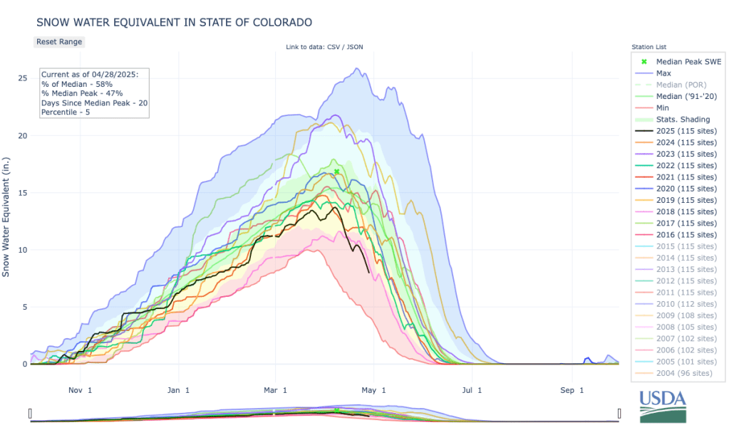 Iโm especially worried about the Upper San Juan River and the Rio Grande, both of which have their headwaters in the southeast San Juan Mountains, which are running close to empty, snow-wise. Yes, Wolf Creek got pounded by the April 6-9 storms, but it has also experienced some abnormally high average temperatures over the last several days โ the average temperature in the Rio Grande Headwaters on April 12 was 45.5ยฐ F, compared to the median for that date of 32ยฐ. If that continues, what little snow is left will mostly be gone within weeks.