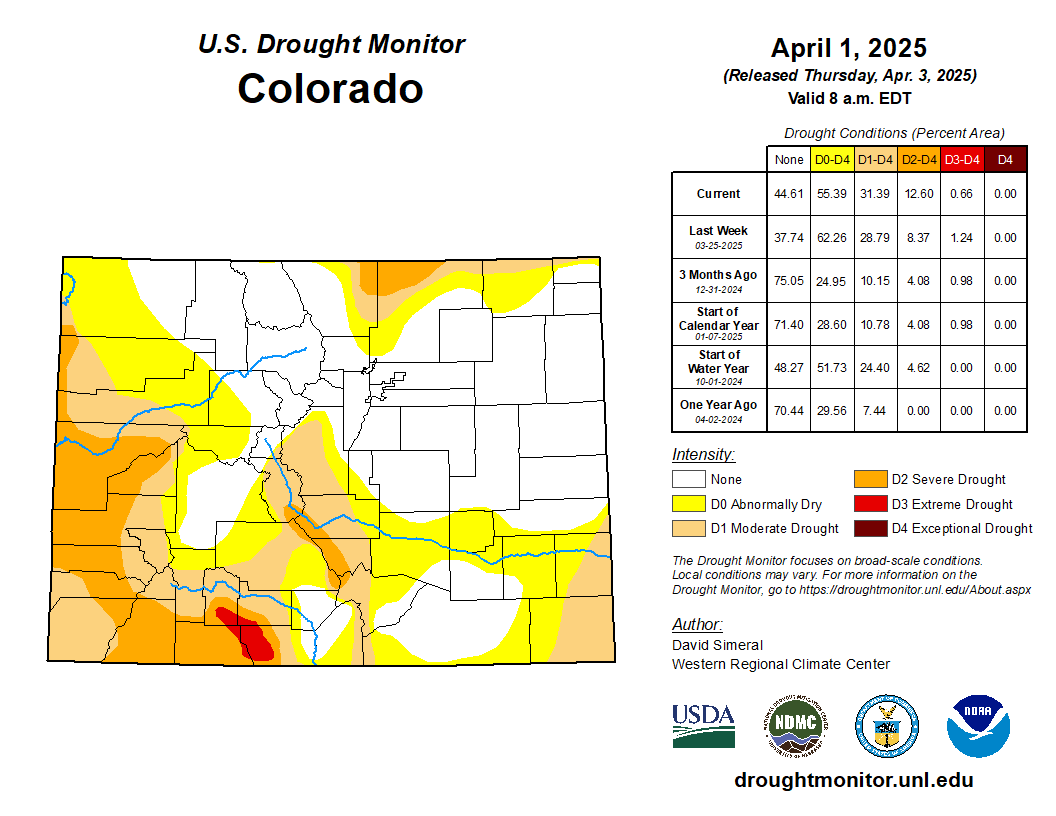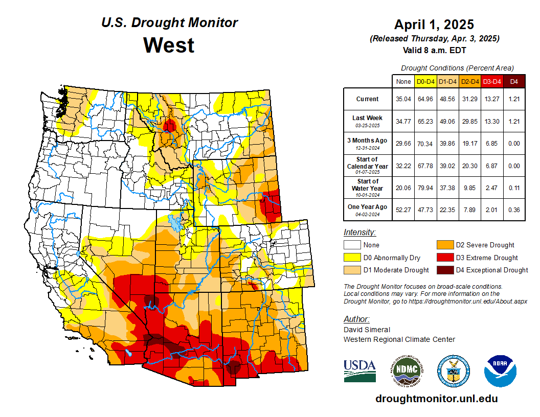 Out West, a series of Pacific storms delivered heavy rain to the lower elevations and snow to the higher elevations of the Pacific Northwest and Northern California. In the Lake Tahoe area, 7-day snowfall totals ranged from 1 to 2+ feet, while areas of the Klamath Mountains of northwestern California received totals up to 3 feet. Other mountain regions, including the Cascades of Oregon, the Wasatch and Uintas of Utah, and the northern Rockies, received accumulations ranging from 6 to 24 inches. Looking at the regional snowpack, the NRCS SNOTEL network is reporting (April 1) the following region-level (2-digit HUC) SWE levels: Pacific Northwest 104%, Missouri 98%, Upper Colorado 89%, Great Basin 103%, Lower Colorado 49%, and Rio Grande 49%. In the Desert Southwest, areas of Extreme Drought (D3) expanded in northeastern and southeastern Arizona in response to very low streamflows and below-normal precipitation since the beginning of the Water Year (Oct 1). In areas of southwestern and south-central Colorado, degradations were made on the map where snowpack conditions at numerous NRCS SNOTEL stations are reporting well below-normal SWE levels. Likewise, poor snowpack conditions have been observed in the mountain ranges of southern Utah, northern Arizona, and northern New Mexico…