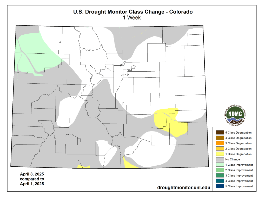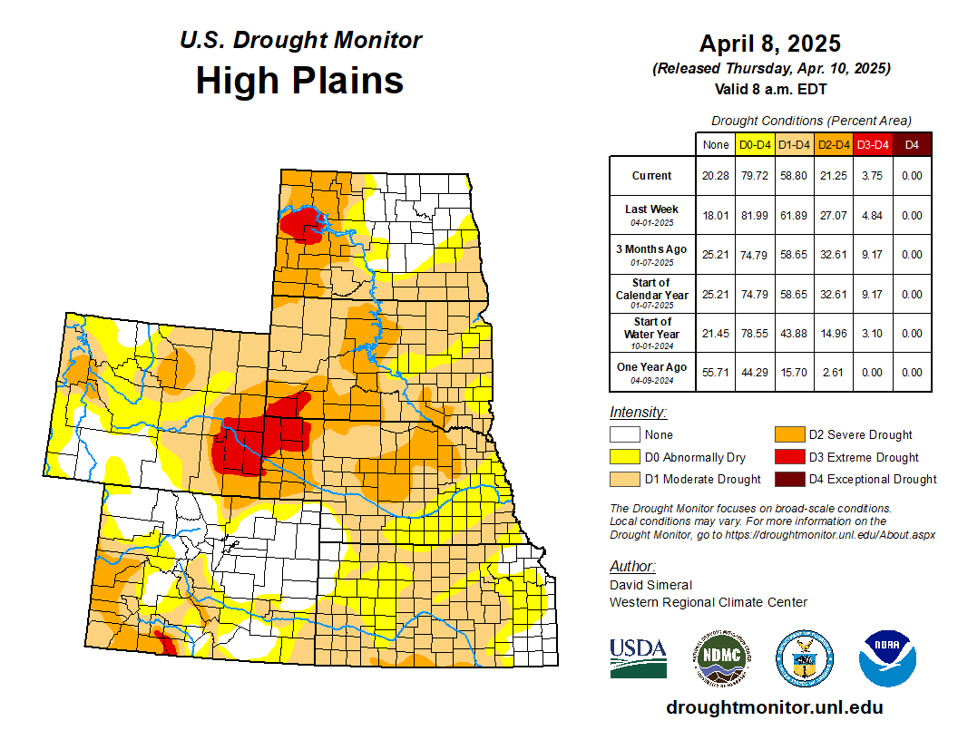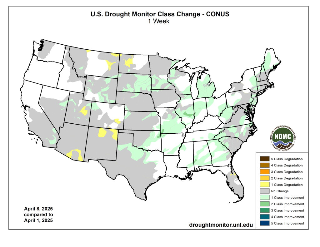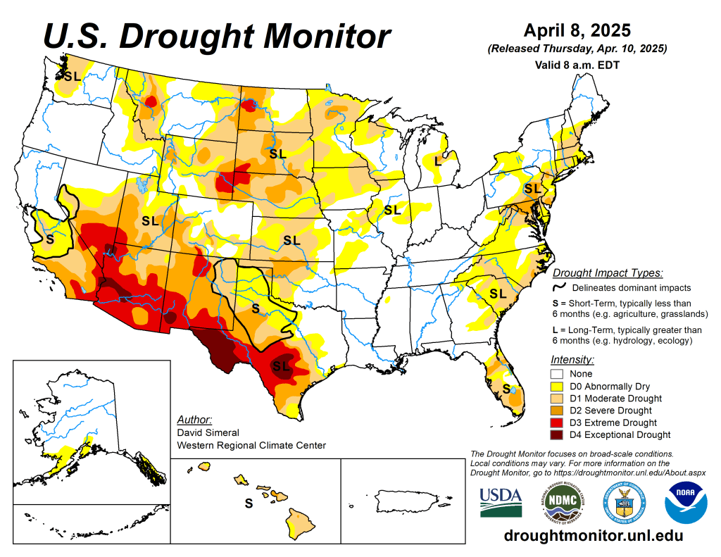 Out West, generally dry conditions prevailed over much of the region, including areas of California, the Great Basin, the Intermountain West, and the Desert Southwest (southern Arizona and southwestern New Mexico). However, some mountain locations in the Pacific Northwest and the Rocky Mountains received light-to-moderate precipitation accumulations. On the map, areas of Extreme (D3) drought were introduced in southeastern Arizona, where precipitation deficits existed at both short- and longer-term time scales. Similarly, ongoing below-normal snowpack conditions (snow water equivalent at NRCS SNOTEL stations ranging from 6 to 55% of median) in the Nacimiento, San Juan, and Sangre de Cristo ranges of New Mexico, led to the introduction of areas of Extreme (D3) drought. Elsewhere, some improvements were made on the map in drought-affected areas of northeastern Nevada, northeastern Utah, northwestern Colorado, and Wyoming. Looking at the regional snowpack, the NRCS SNOTEL network is reporting (April 8) the following region-level (2-digit HUC) SWE levels: Pacific Northwest 102%, Missouri 97%, Upper Colorado 89%, Great Basin 104%, Lower Colorado 69%, and Rio Grande 46%…