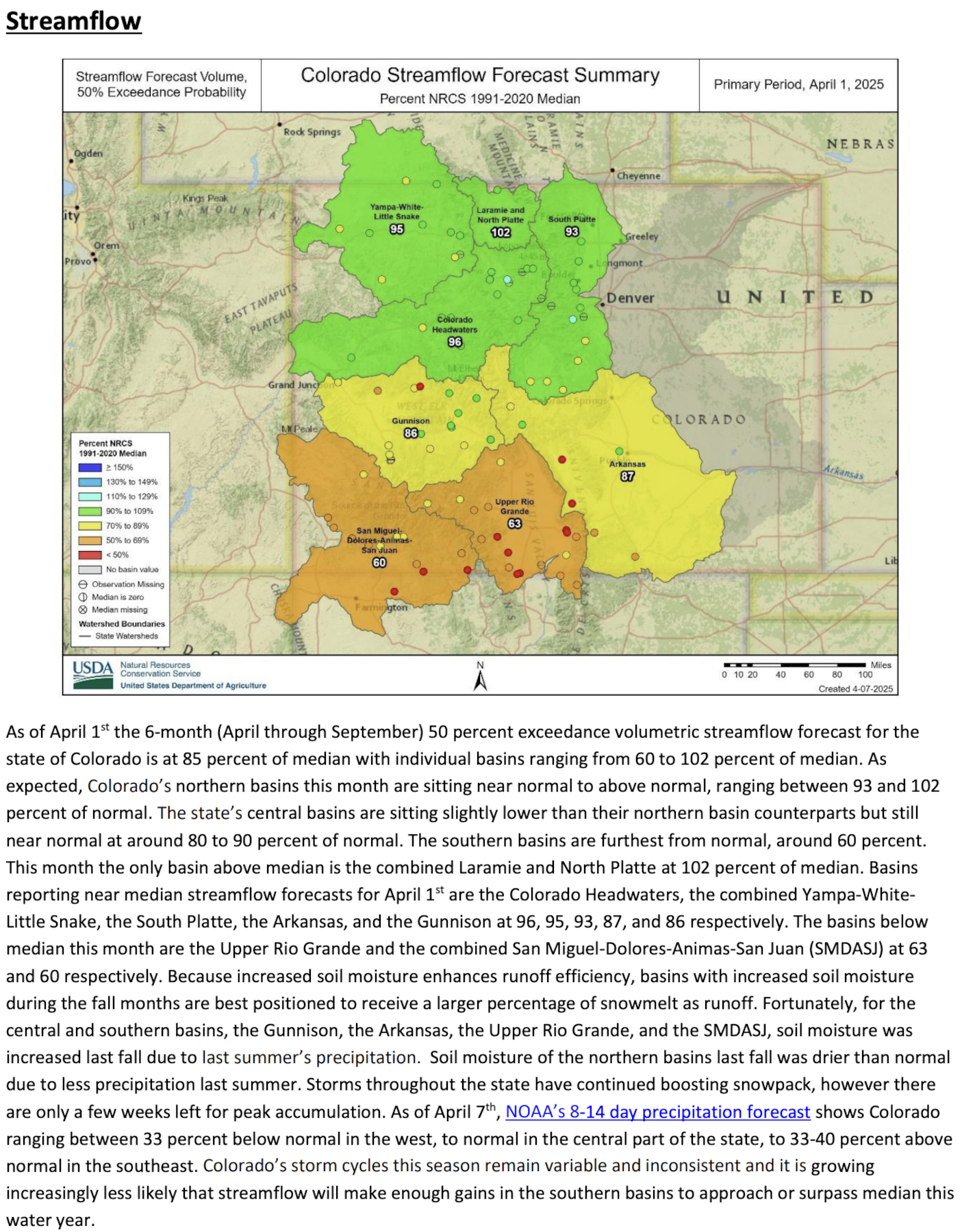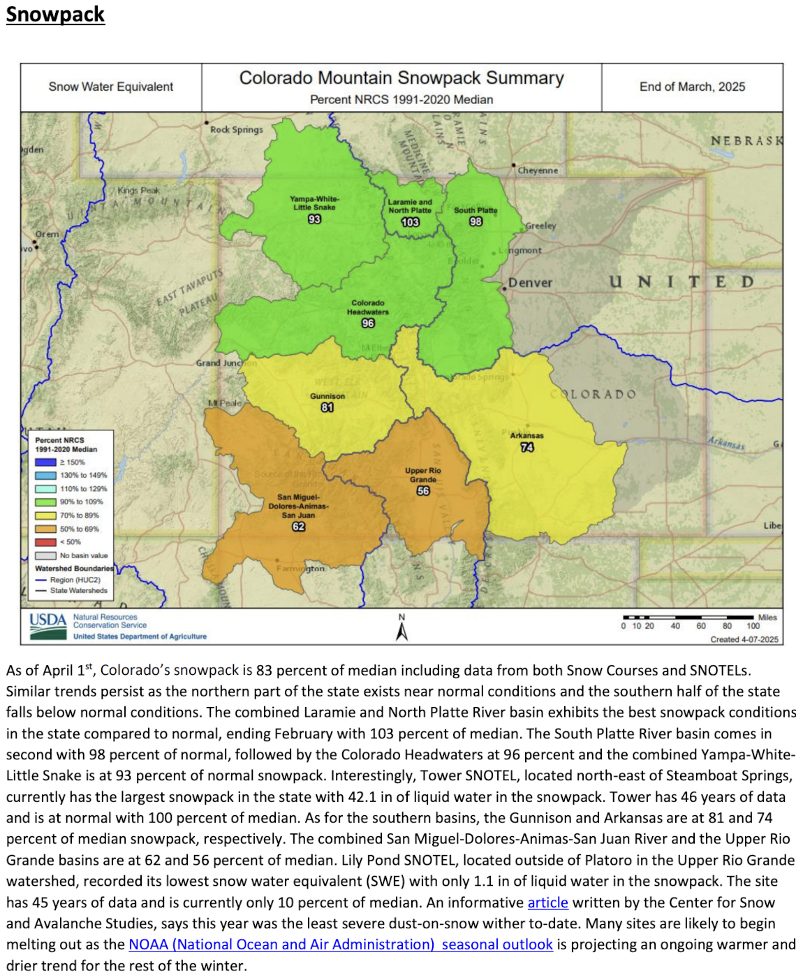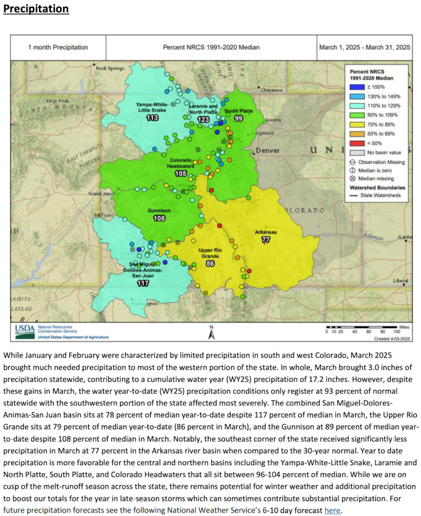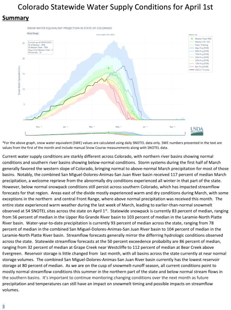 The April 1, 2025 #Colorado Water Supply Outlook is hot off the presses from the NRCS Click the link to read the outlook on the NRCS website. Here’s an excerpt: Share this: Share on Bluesky (Opens in new window) Bluesky Share on LinkedIn (Opens in new window) LinkedIn Share on Facebook (Opens in new window) Facebook Email a link to a friend (Opens in new window) Email Print (Opens in new window) Print Share on X (Opens in new window) X Like this:Like Loading...