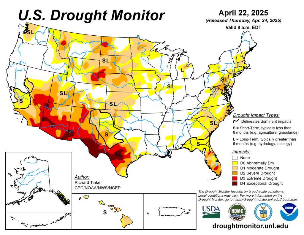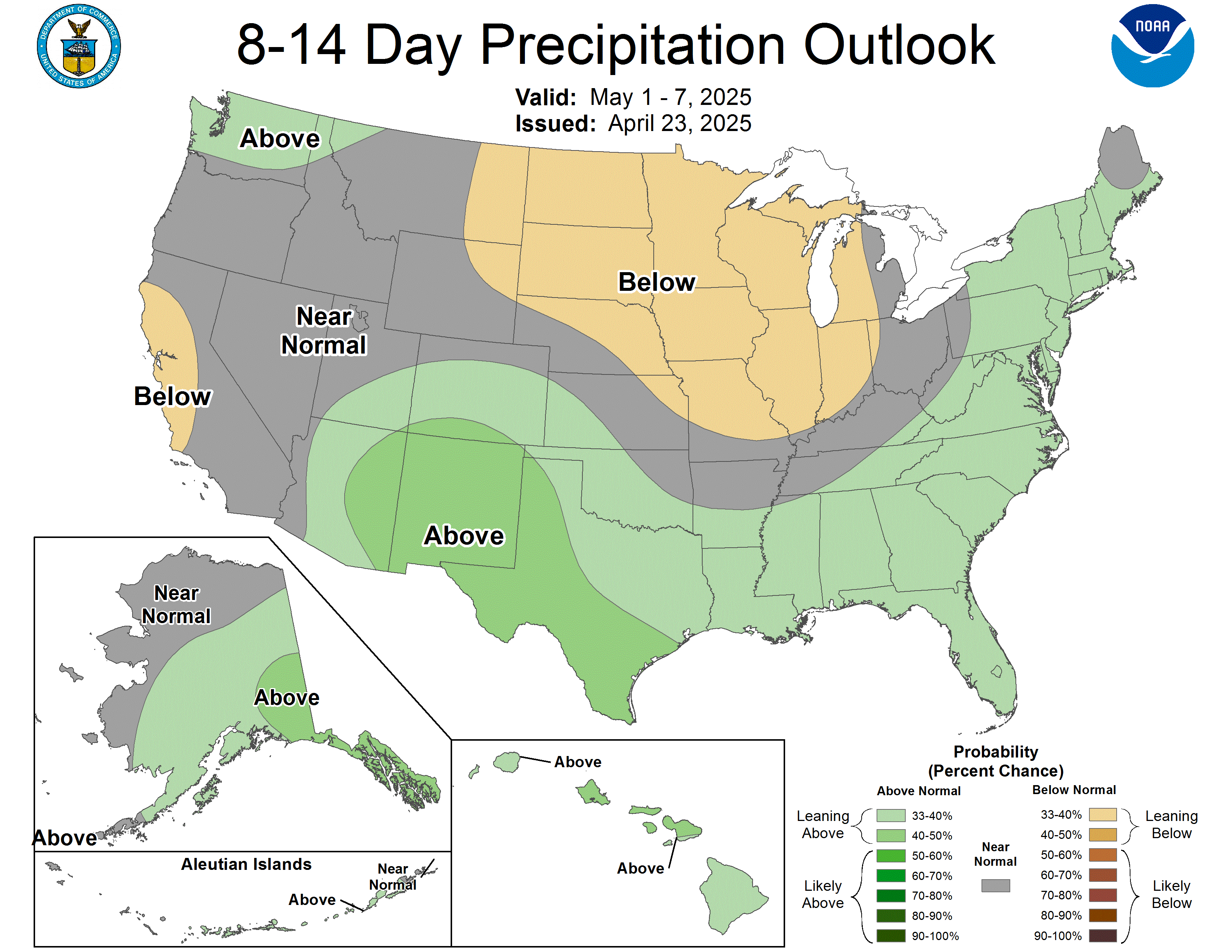The Climate Prediction Center’s 6-10 day outlook valid April 29 – May 3, 2025 favors wetter than normal conditions southeastern Rockies eastward through the Middle and Lower Mississippi Valley, and most of the Eastern States outside eastern New England and southern Florida. Meanwhile, subnormal precipitation is most likely across the northern Plains, central and western Rockies, the Intermountain West, and California. Wet weather is slightly favored in the remaining dry areas in southeastern Alaska and Hawaii. Warm weather should prevail across the contiguous United States outside the southern High Plains and adjacent Rockies. The greatest odds for warmth extend from California and the Great Basin through the northern Rockies and Intermountain West, plus across the lower Mississippi Valley and the Eastern States. Warmth is also significantly favored across Hawaii. Subnormal temperatures are expected to be limited to Alaska.