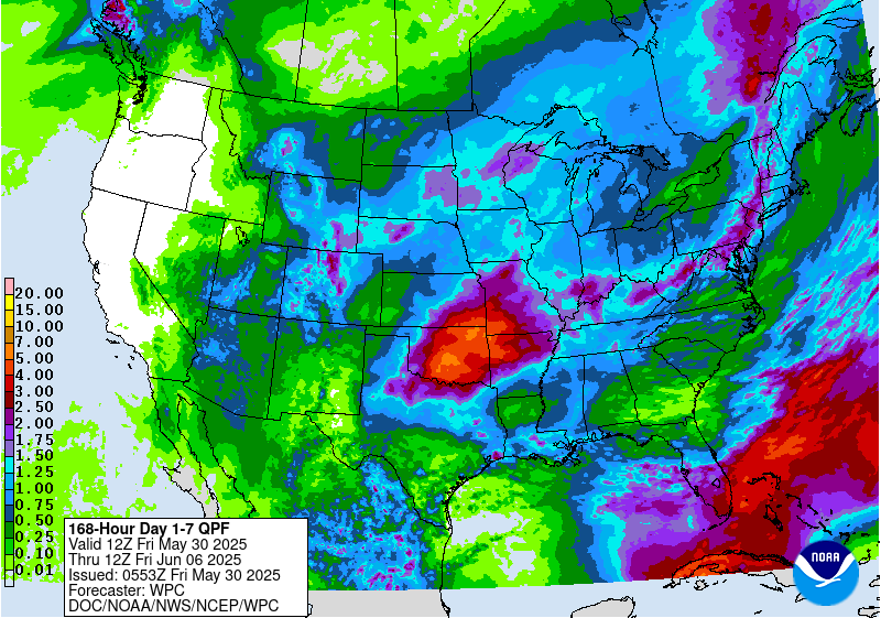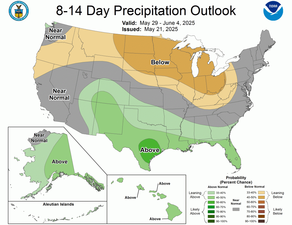 The Climate Prediction Centerโs 6-10 day outlook (valid June 3-7, 2025) favors above-normal precipitation for the Florida Peninsula, Middle to Upper Mississippi Valley, and Great Plains. The precipitation outlook leans towards above-normal precipitation for much of the West. Elevated below-normal precipitation probabilities are forecast across the Mid-Atlantic and Northeast. Alaska and Hawaii are favored to be on the wetter side during the first week of June. Above-normal temperatures are favored from the Mississippi Valley to the East Coast, while below-normal temperatures are more likely throughout the West and Alaska. A slight lean towards above-normal temperatures are forecast for most of Hawaii.