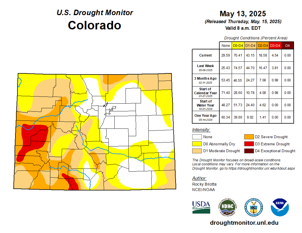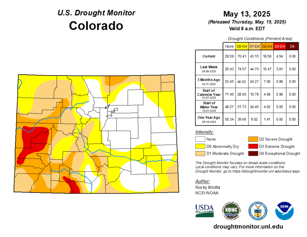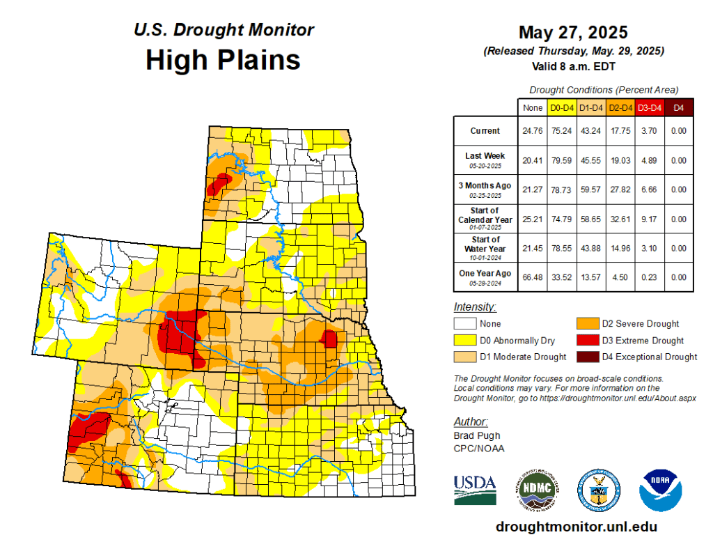 From May 24-26, widespread precipitation (1 to 3 inches, locally more) resulted in a 1-category improvement to portions of southwestern South Dakota, Nebraska, Kansas, and northeastern Colorado. Much cooler temperatures accompanied this widespread precipitation which contributed to topsoil moisture recharge. Based on multiple indicators such as the SPI at various time scales and soil moisture, severe (D2) to extreme (D3) drought was reduced in coverage across central to western Nebraska along with adjacent areas of southwestern South Dakota. Although precipitation was lighter across southeastern Colorado, SPIs at multiple time scales, soil moisture, and VegDri no longer support any D1. Southern Nebraska and northern Kansas missed out on this past weekโs precipitation and a couple of small 1-category degradations were made. A 1-category degradation was also warranted for western Colorado based on 90 to 180-day SPI…