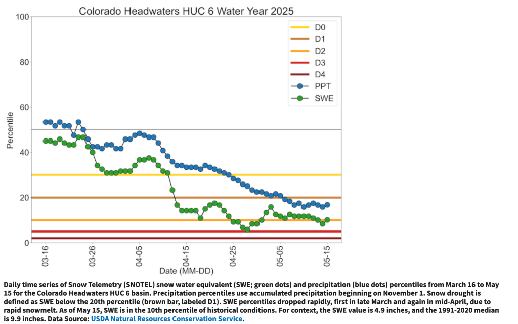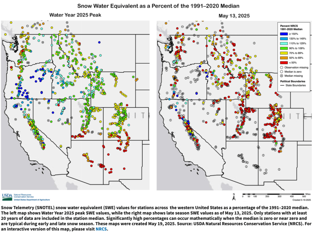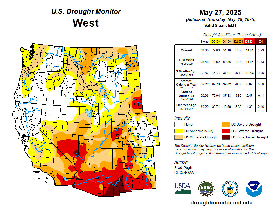 Based on 6-month SPI, water-year-to-date (October 1, 2024 to May 26, 2025) precipitation deficits, and 28-day average streamflow, moderate drought (D1) was expanded to include more of southwestern Washington. Increasing 30 to 90-day precipitation deficits, low 28-day average streamflows, and declining soil moisture led to the introduction of D1 to parts of northwestern and northeastern Oregon. The 6-month SPI supported the expansion of severe drought (D2) coverage across southwestern Utah. Although precipitation was light this past week, SPIs dating back 120 days along with more favorable soil moisture indicators led to improvements across southwestern and eastern Montana. Conversely, in northwest Montana, D1 was degraded to D2 based on 120-day SPI and declining soil moisture. To the east of the Sierra Nevada Mountains, abnormal dryness (D0) was expanded to the south of Lake Tahoe due to drier-than-normal conditions since April…