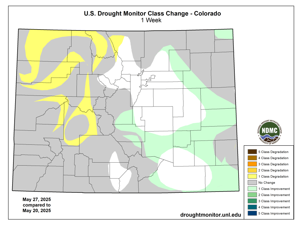 Colorado Drought Monitor one week change map ending May 27, 2025.