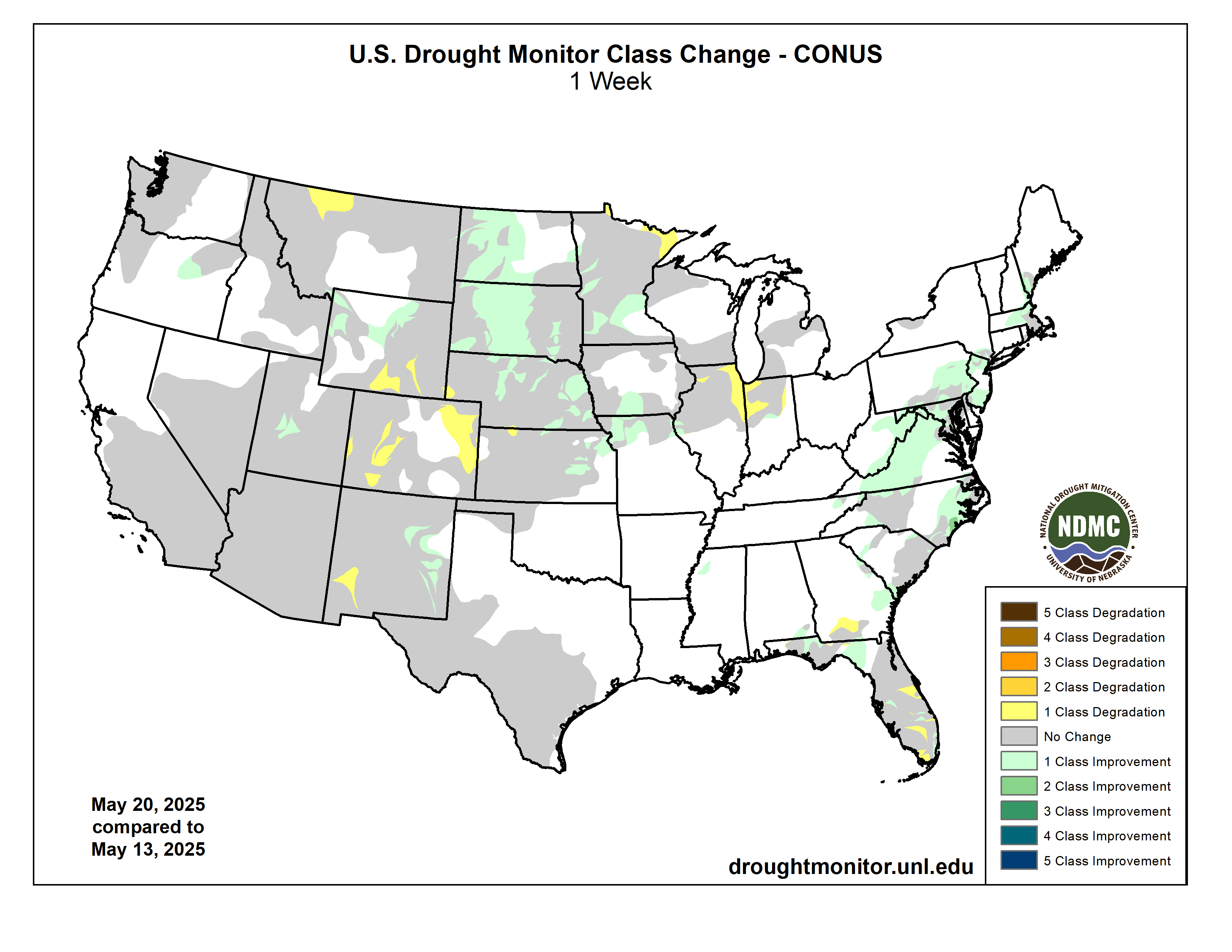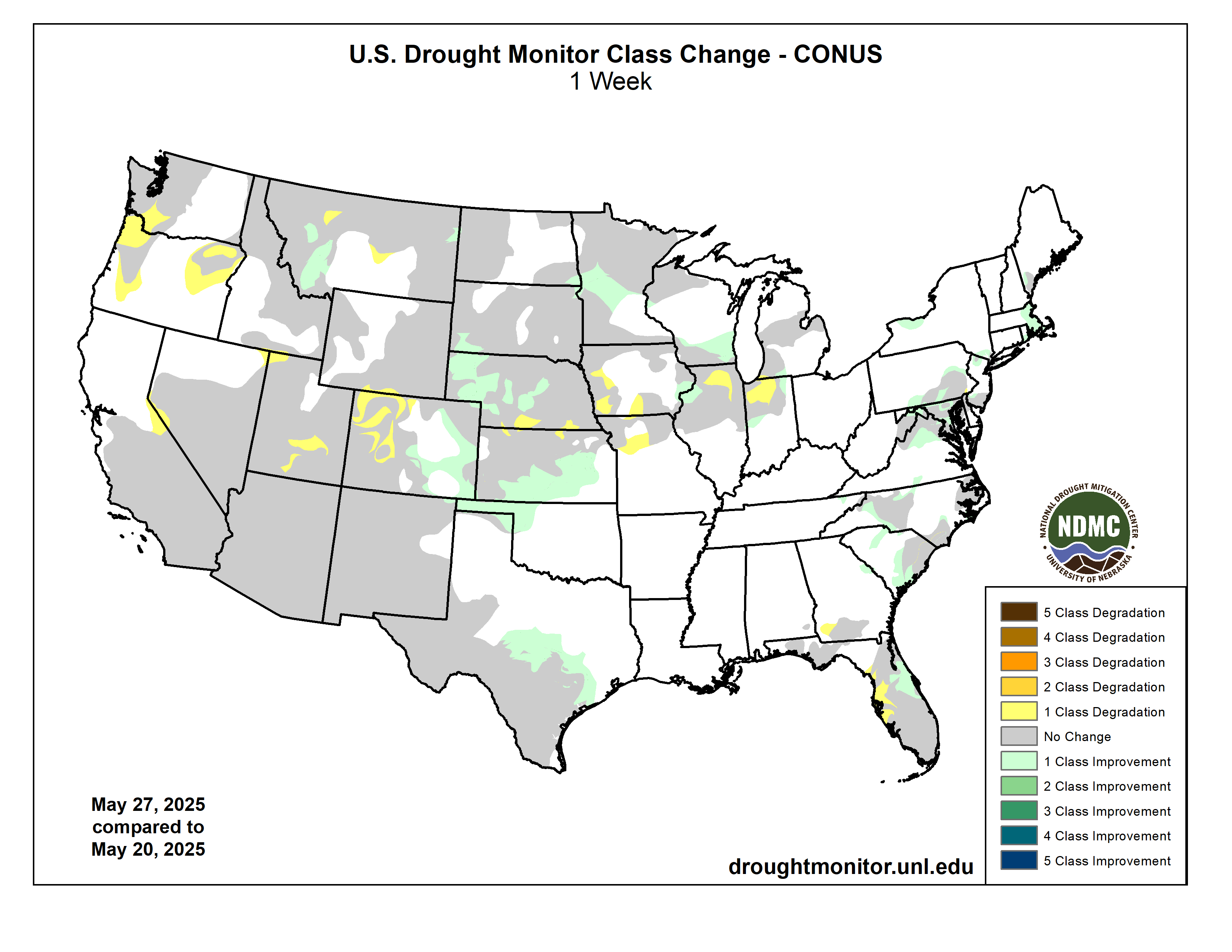 US Drought Monitor one week change map ending May 27, 2025.