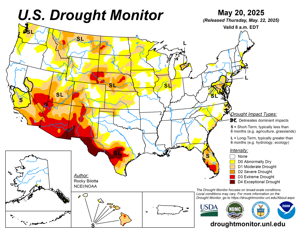 The wet May pattern continued to alleviate or bring an end to drought across the Northeast. Severe to extreme drought persists for central to south Florida although locally heavy showers fell across the east-central Florida Peninsula as the rainy season begins to ramp up. Widespread precipitation (2 inches or more) supported improvements to the Central and Southern Great Plains. During recent weeks, drought developed across portions of southwestern Iowa, northern Illinois, and northwestern Indiana. Short-term drought expanded across the Pacific Northwest and intensified for southern Utah and northwestern Colorado during mid to late May. From May 20-26, above-normal temperatures were limited to the southern tier of the contiguous U.S. 7-day temperatures averaged 4 to 10 degrees F below normal across the Northeast, Corn Belt, and Northern to Central Great Plains. Alaska and Puerto Rico are drought-free, while drought of varying intensity continues for parts of Hawaii…