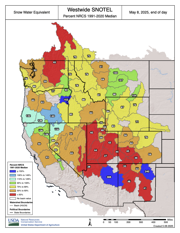May began with a strong storm system delivering over 3 inches of moisture at some sites in the Sangre de Cristos and San Juans, including the SMDASJ, URG and Arkansas River basins. The Front Range mountains are also benefitting from the early May storm, primarily east of the divide. Southwest basins typically receive around 7% of their annual precipitation in May, much of which falls as snow at higher elevations. During spring, however, this precipitation can fall as rain on snowpack unless temperatures cool significantly. “With this recent storm cooler temperatures prevailed, resulting in observed snowfall in many high elevation sites. While this early May storm did not benefit all regions equally, the widespread drop in temperatures will help reduce melt rates and slow runoff timing across the state,” notes Nagam Bell, NRCS hydrologist.