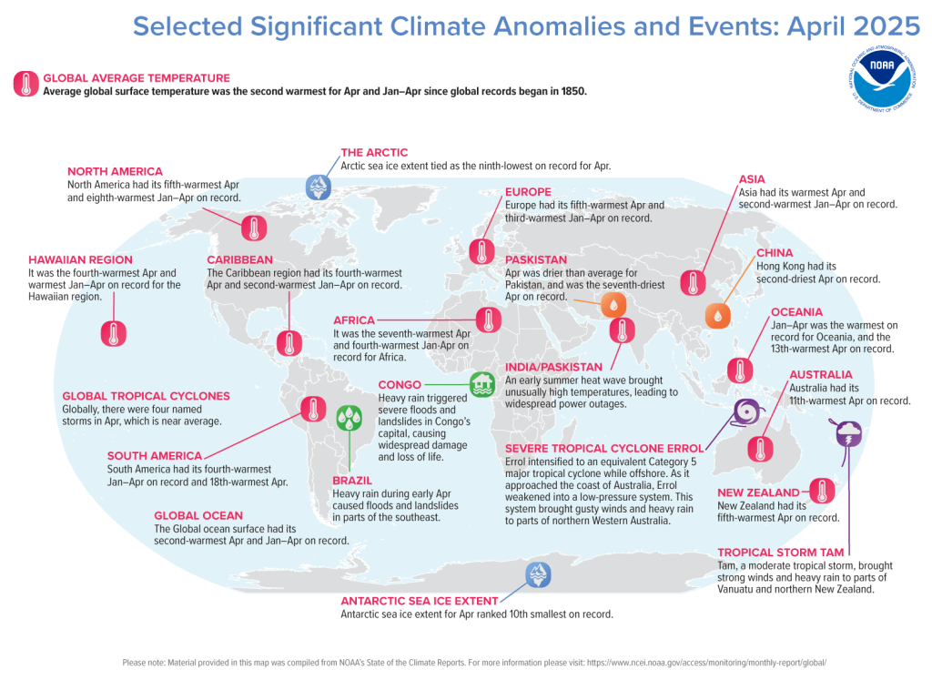 For a more complete summary of climate conditions and events, see our April 2025 Global Climate Report or explore our Climate at a Glance Global Time Series.
