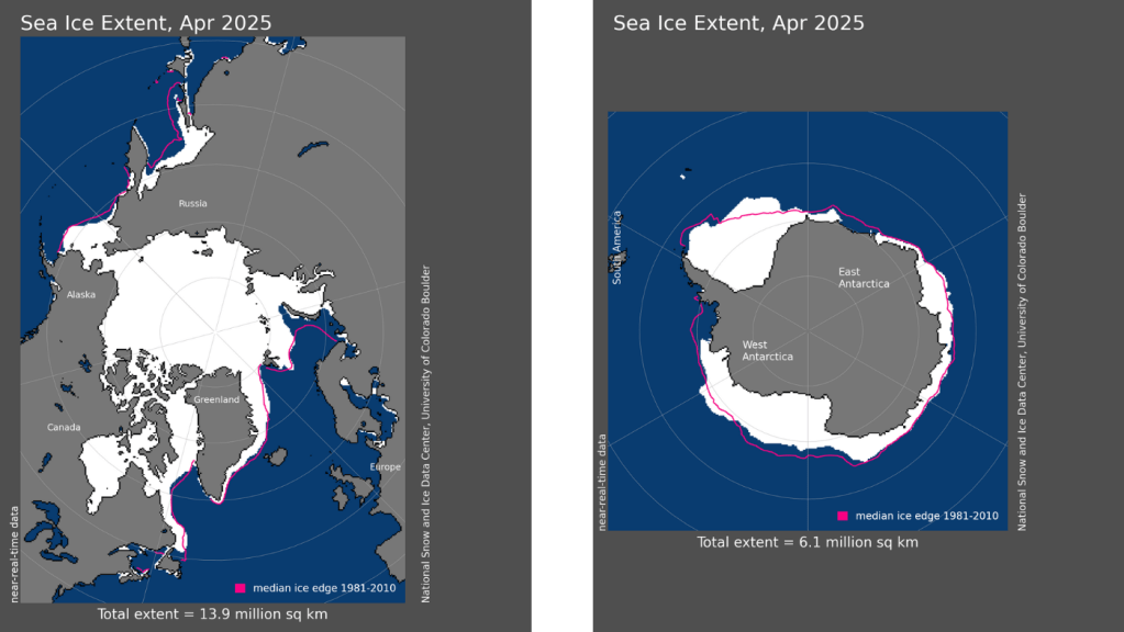 The Northern Hemisphere snow cover extent in April was 820,000 square miles below average, tying with 2024 as the smallest April snow cover extent on record. Snow cover over North America and Greenland was below average (by 120,000 square miles), and Eurasia was also below average (by 710,000 square miles). A lack of snow cover was particularly obvious over the United States and central Eurasia.