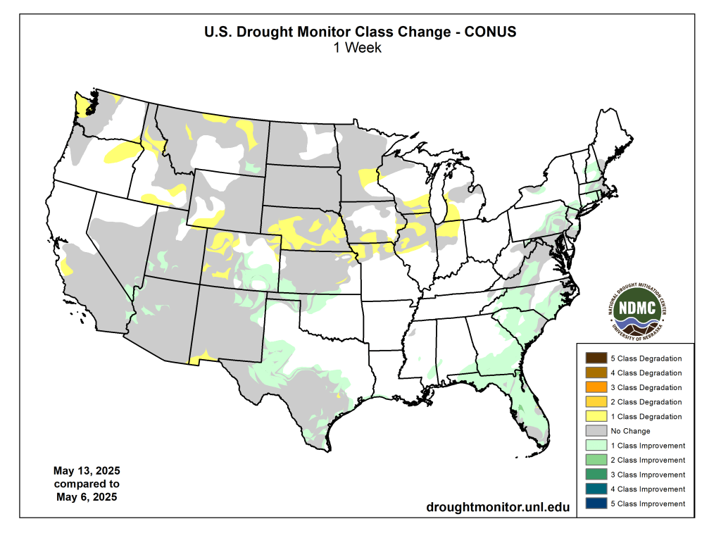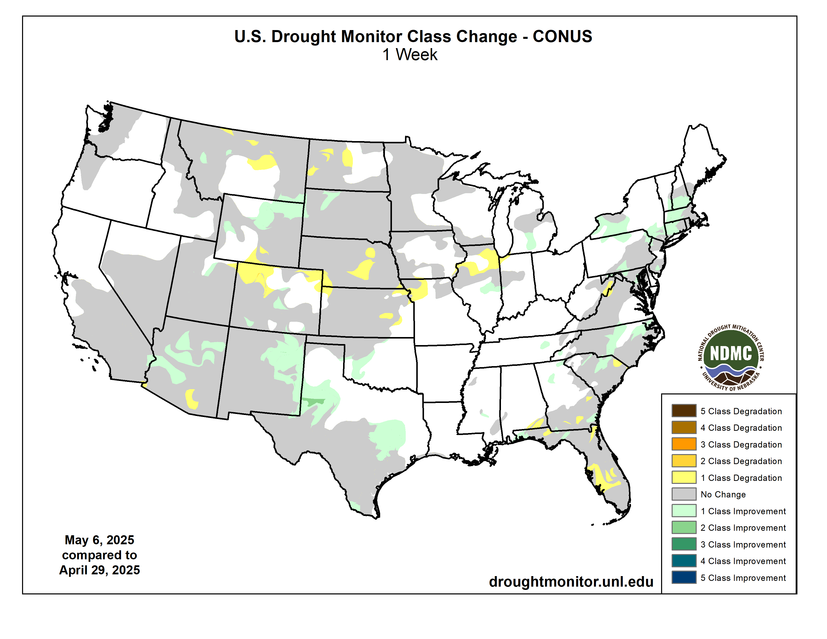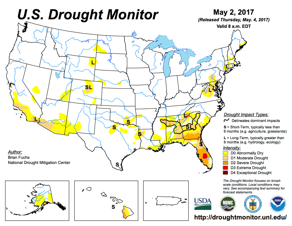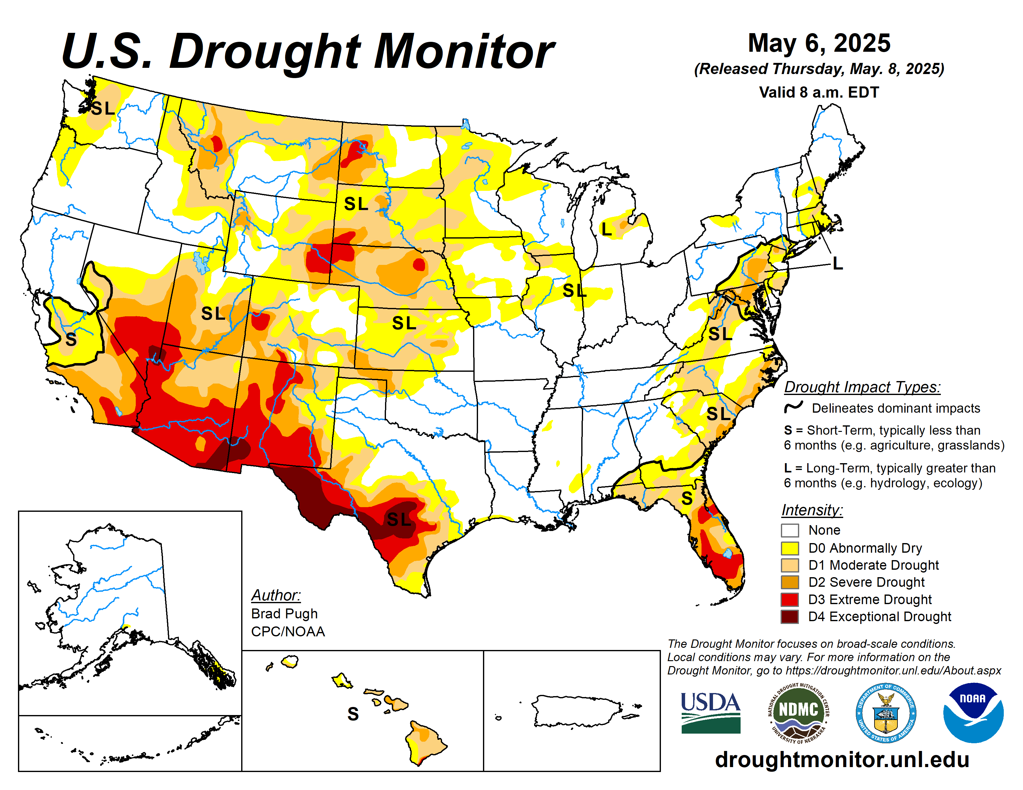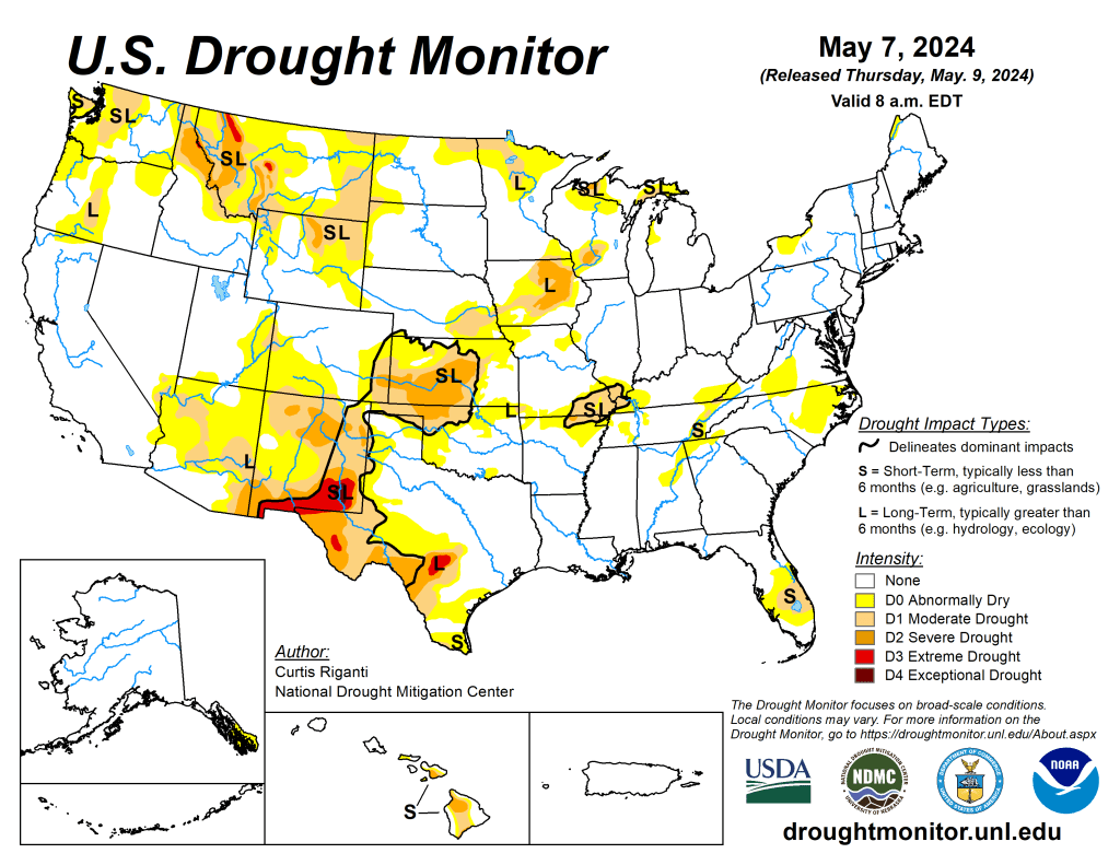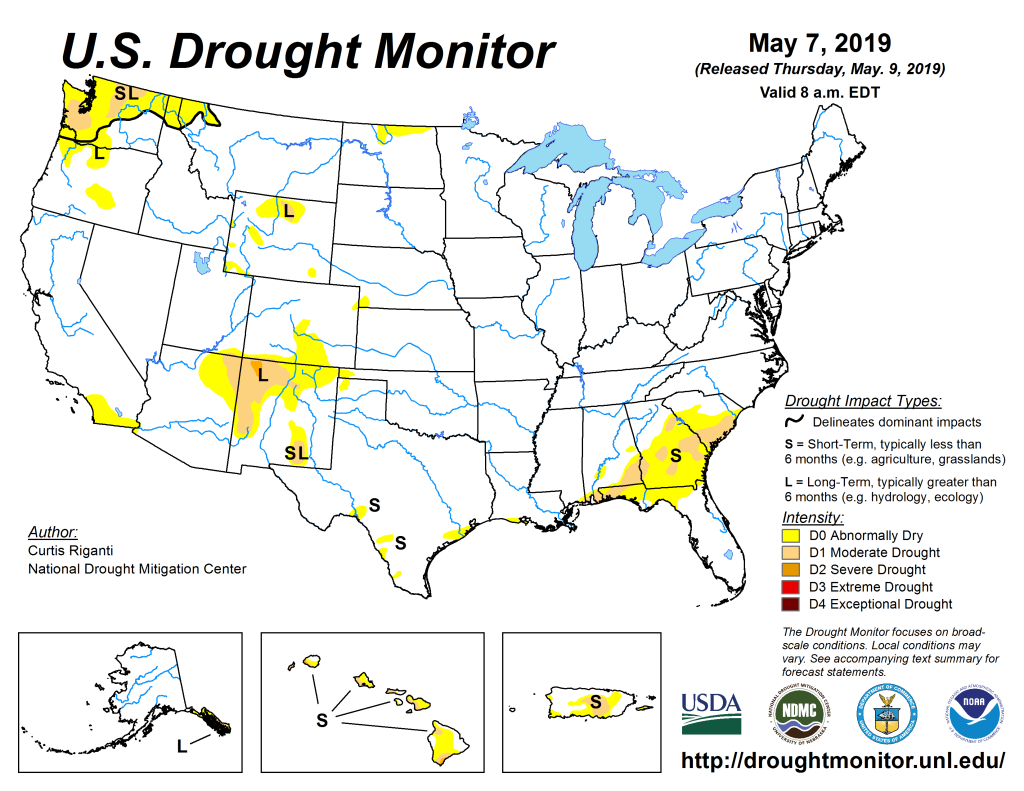 Precipitation fell across much of the U.S. this week, with heavier amounts (> 1 inch) falling from portions of the central and southern Plains eastward to the East Coast, and also in parts of the West, Hawaii, and southern Alaska. Much of the Southeastern U.S., from eastern Texas to North Carolina, reported weekly rainfall totals between 2 to 10 inches, while similar amounts (2 to 6 inches) were reported in parts of the Northeast. Above-normal precipitation supported drought improvements across large portions of the South, Southeast and Northeast, and in parts of the Southwest and High Plains. Conversely, weekly precipitation totals were below normal across much of the West to the Midwest. Drought and abnormal dryness were expanded or intensified in northern portions of the West and Midwest, as well as parts of the Southwest and High Plains. Temperatures were above normal across much of the U.S. this week, with areas of the north-central U.S., from central Montana to Minnesota, reported temperatures 9 to 20 degrees above normal. Below-normal temperatures were observed from the southern Plains to parts of the eastern Midwest, where departures were up to 10 degrees F below normal, with the largest departures being reported in parts of Texas…