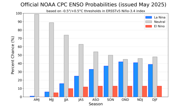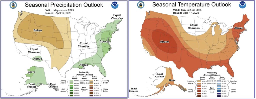 The Climate Prediction Centerโs 6-10 day outlook (valid May 18โ22, 2025) favors above-normal precipitation across most of the U.S., with below-normal precipitation favored in portions of the West Coast states and the Florida Peninsula. Increased probabilities for above-normal temperatures are forecast for Hawaii, from the southern Plains to the Southeast, and in parts of California, Nevada, and southern Alaska.
