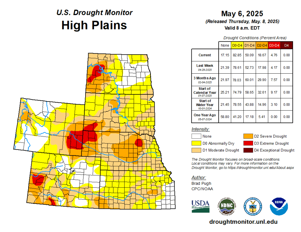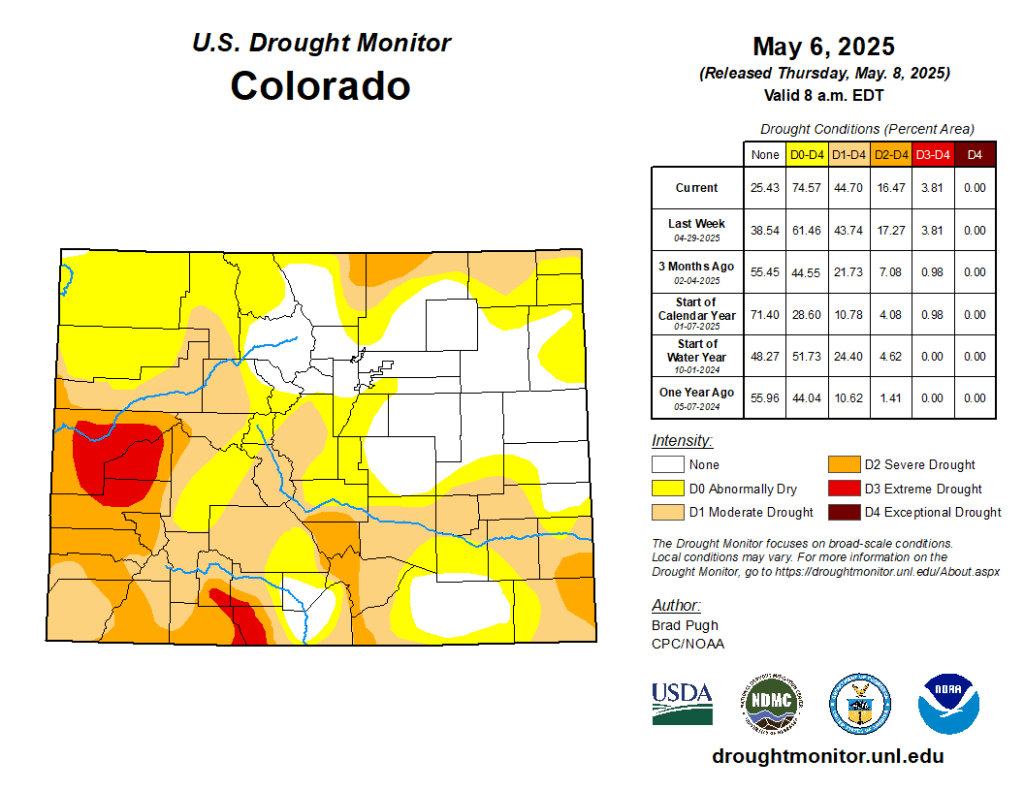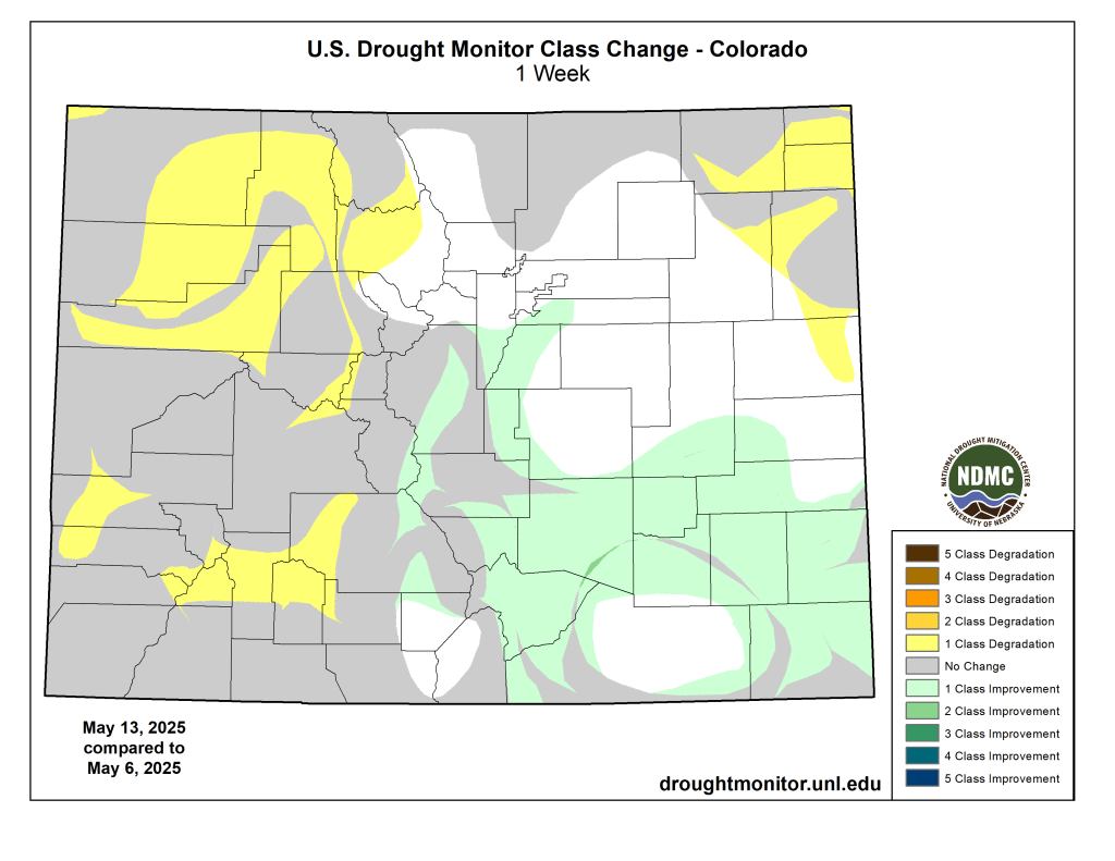Warm temperature dominated the High Plains this week, with departures ranging up to 20 degrees F above normal, especially along the northern portions of the region, while cooler-than-normal temperatures were observed along the southern border. Precipitation fell across the western and southern portions of the region this week; however, in most areas, amounts were insufficient for significant improvement. Beneficial heavy precipitation (1 to 3 inches) in eastern Colorado and Kansas led to improvements in moderate to severe drought (D1-D2) and abnormal dryness (D0) in these areas. Conversely, dry conditions resulted in the introduction and expansion of drought. Extreme drought (D3) was introduced in western Nebraska, and moderate to extreme drought (D1-D3) expanded in western Colorado and eastern Nebraska. Abnormal dryness was also expanded in southern Wyoming this week…