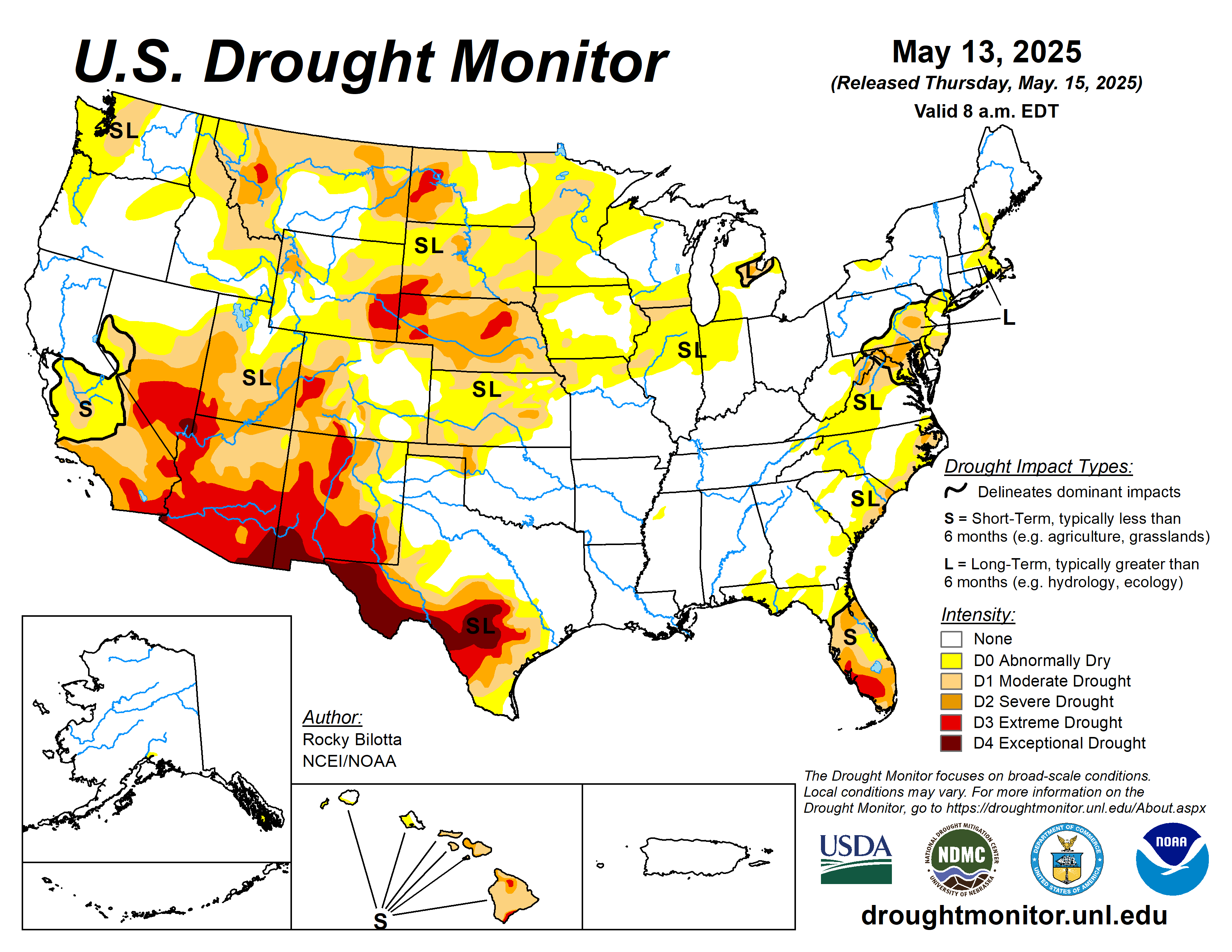 During the next five days (May 13โ17, 2025), the slow moving upper low across the Southeast U.S. will be weakening and evolving into an open trough by Thursday as it exits the East Coast. Another upper trough and closed low across the Northern Rockies mid-week will sustain a surface low crossing the Northern Plains and then into south-central Canada by the end of the week, with heavy rain for the Dakotas/Minnesota and late season mountain snow for the northern Rockies. Going into Thursday, the heavier rainfall reaches eastern North Dakota into northern Minnesota, with some of the guidance indicating the potential for 1-2 inch rainfall totals with some embedded convection. Very warm weather will continue across the Upper Midwest for the middle of the week, with highs reaching 85-90 degrees on Wednesday across the eastern Dakotas and much of Minnesota. The anomalous warmth then shifts eastward to the Great Lakes and Ohio Valley regions to close out the week, and much of the East Coast Friday into Saturday ahead of the cold front. Very hot conditions are expected across southern Texas for the entire forecast period with highs exceeding 100 degrees near the Rio Grande, and HeatRisk reaching the major category for these areas. In contrast, chilly conditions are likely for the Intermountain West and Northern Rockies with highs running 5-15 degrees below average with the upper level trough and increased cloud cover.