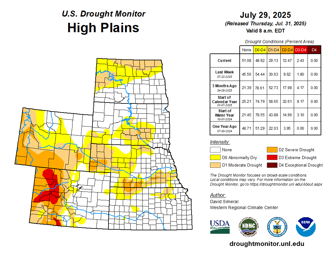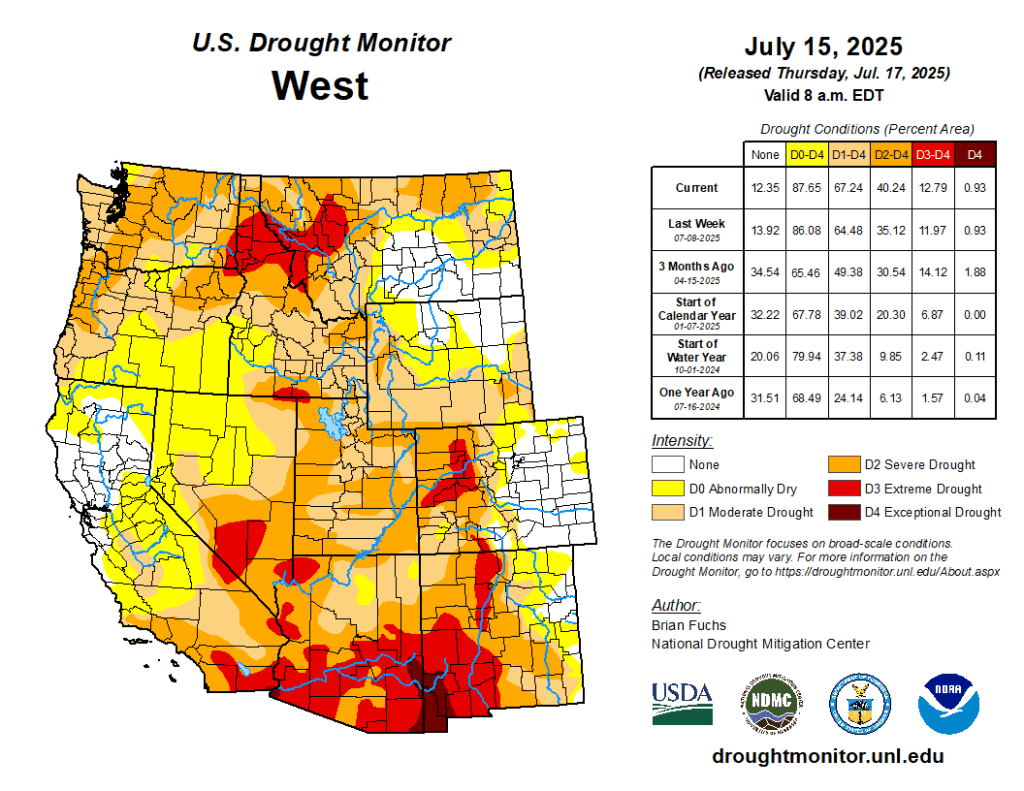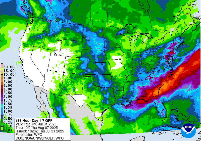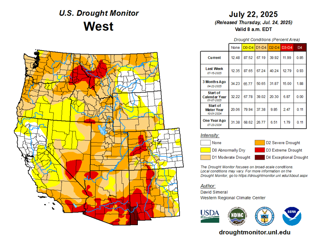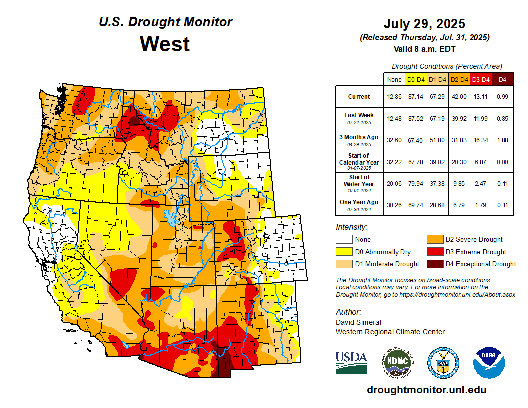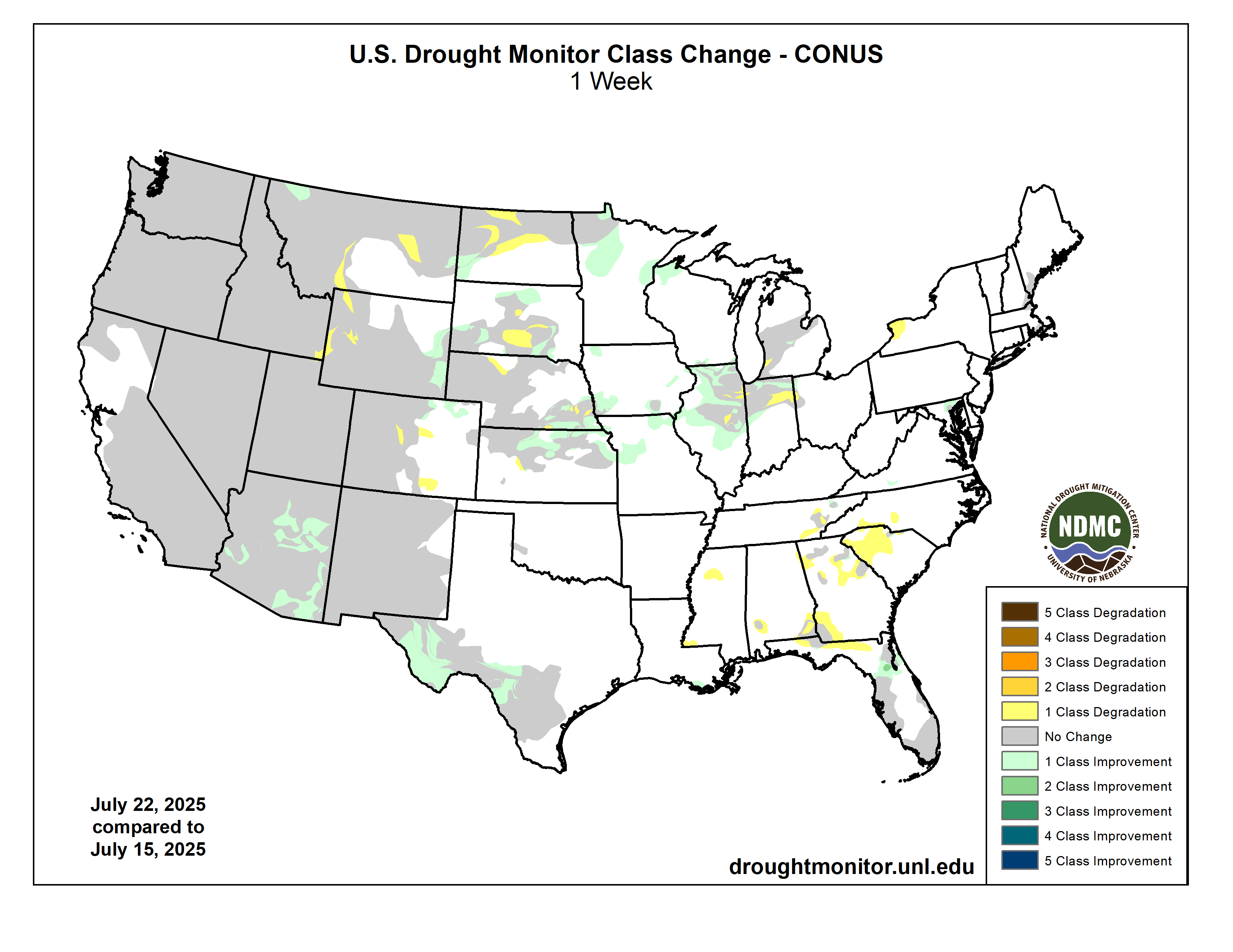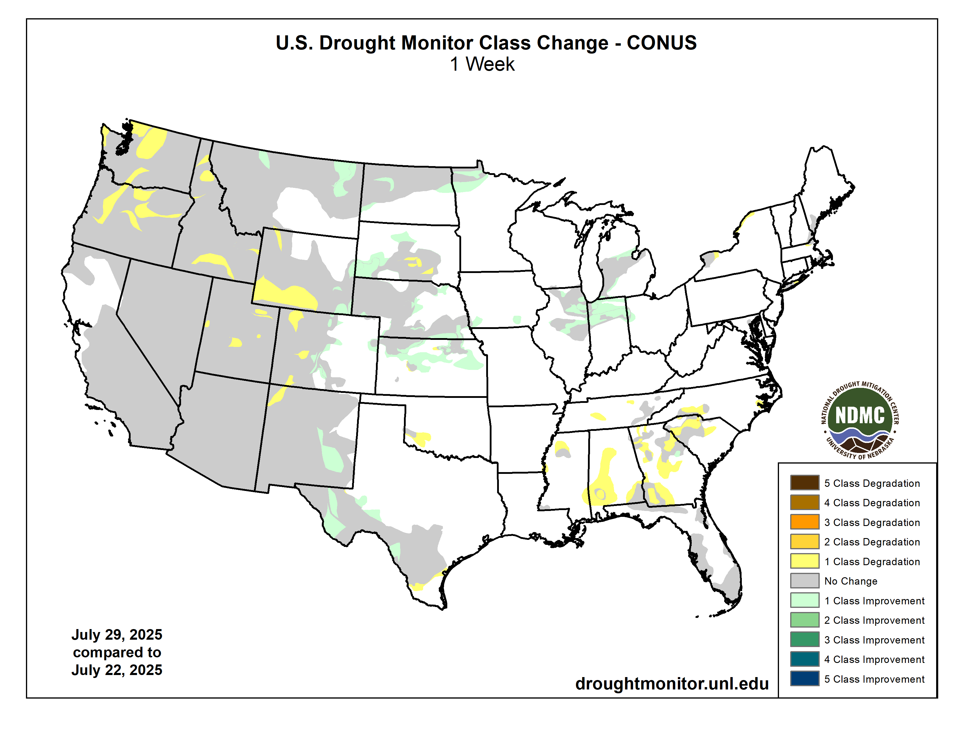This U.S. Drought Monitor (USDM) week saw continued improvement in drought-related conditions across areas of the Midwest (Michigan, Ohio, Indiana, Illinois, Iowa, Minnesota), central and northern Plains (Kansas, Nebraska, Dakotas, eastern Montana), South (Texas), and in the Desert Southwest (New Mexico). During the past week, the most significant rainfall accumulations were observed across areas of Kansas, Missouri, Iowa, and Minnesota, where they ranged from 3 to 7+ inches. Elsewhere, short-term precipitation shortfalls (past 30 to 60 days) led to continued expansion of Abnormally Dry (D0) areas across the Southeast states including the Carolinas, Georgia, and Alabama as well as the introduction of isolated areas of Moderate Drought (D1) in Alabama, Georgia, and South Carolina where agriculture-related drought impacts are being reported. In the South, drought conditions continued to improve in western portions of Texas as well as in areas of eastern New Mexico where monsoonal storms have provided some minor relief to areas experiencing long-term drought. In the West, conditions continued to deteriorate across the Pacific Northwest (Oregon, Washington, Idaho) and areas of the Intermountain West (Wyoming, Utah, and Colorado), while areas of eastern Montana saw improvement in drought in response to precipitation events during the past few weeks. In terms of reservoir storage in the West, Californiaโs major reservoirs continue to be at or above historical averages for the date (July 29), with the stateโs two largest reservoirs, Lake Shasta and Lake Oroville, at 105% and 116% of average, respectively. In the Southwest, the U.S. Bureau of Reclamation is reporting (July 27) Lake Powell at 32% full (46% of average), Lake Mead at 31% full (51%), and the total Colorado system at 39% of capacity (compared to 44% of capacity the same time last year)…