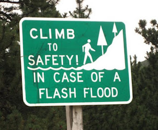 Sign that says โClimb to safety! In case of a flash floodโ, which are seen in many canyons in Colorado.