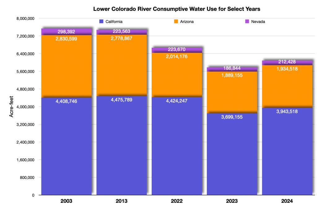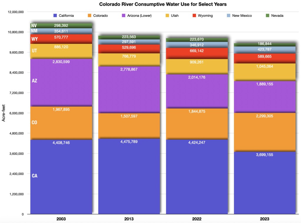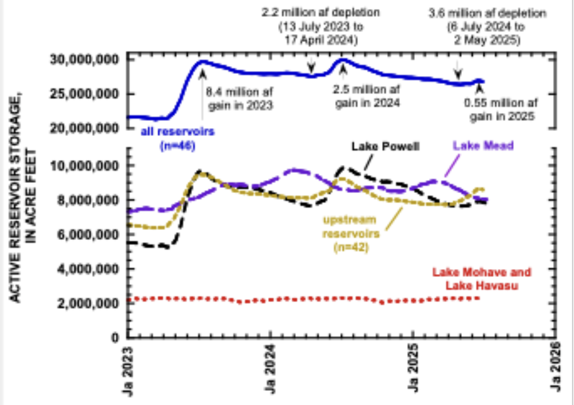 Figure 1. Graph showing reservoir storage in different parts of the Colorado River Basin since 1 January 2023. Total storage in March 2023 was the lowest in the 21st century. Storage significantly increased due to 2023 snowmelt, but the accumulation from the 2024 snowmelt was entirely lost. This will also happen in the coming months. On 30 June 2025, active storage in 42 reservoirs upstream from Lake Powell was 8.58 million af, active storage in Lake Mead was 8.05 million af, and storage in Lake Powell was 7.88 million af.