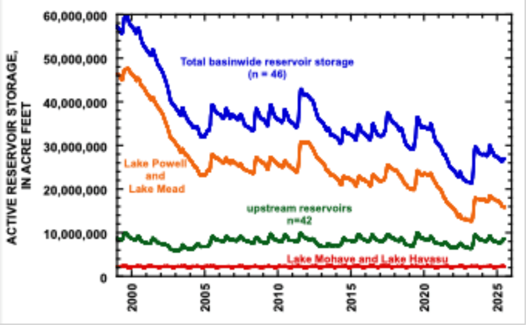 Figure 2. Graph showing reservoir storage in different parts of the Colorado River Basin since 1 January 1999. On 30 June 2025, total basin storage was comparable to what it was in late July 2021