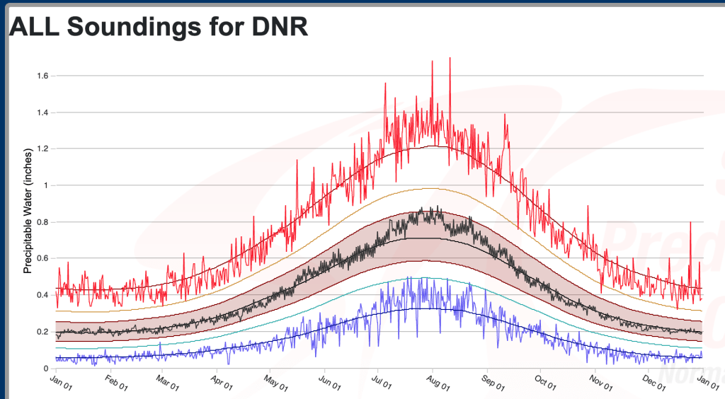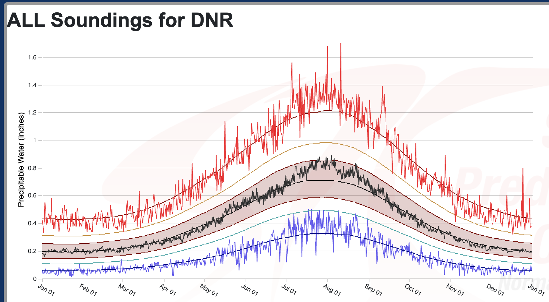 Annual cycle of precipitable water at Denver. The daily average is in the black line, the daily maximum in red, and the daily minimum in blue, with rolling averages also shown. From the NOAA Storm Prediction Center sounding climatology site.