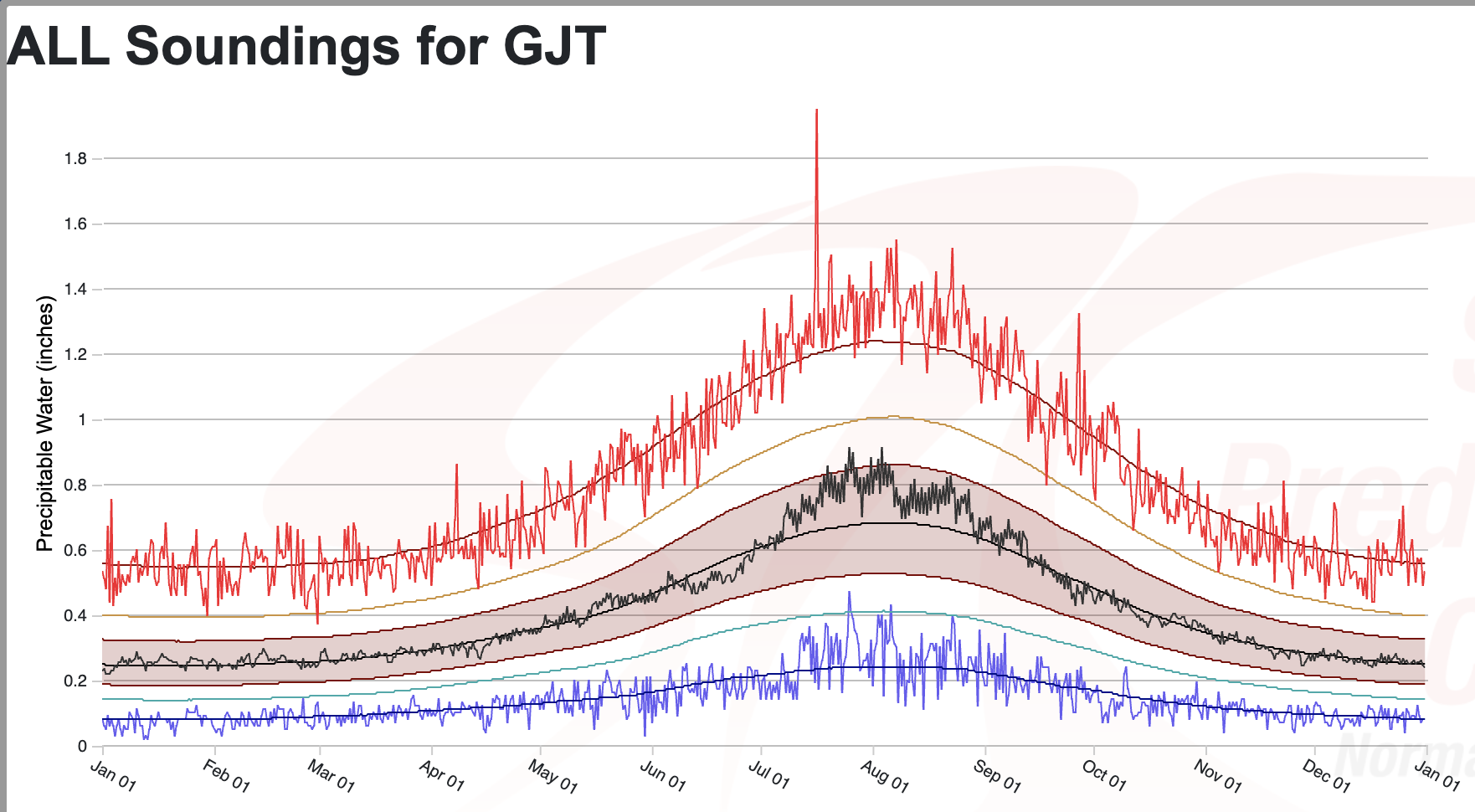 Annual cycle of precipitable water at Grand Junction. The daily average is in the black line, the daily maximum in red, and the daily minimum in blue, with rolling averages also shown. From the NOAA Storm Prediction Center sounding climatology site.