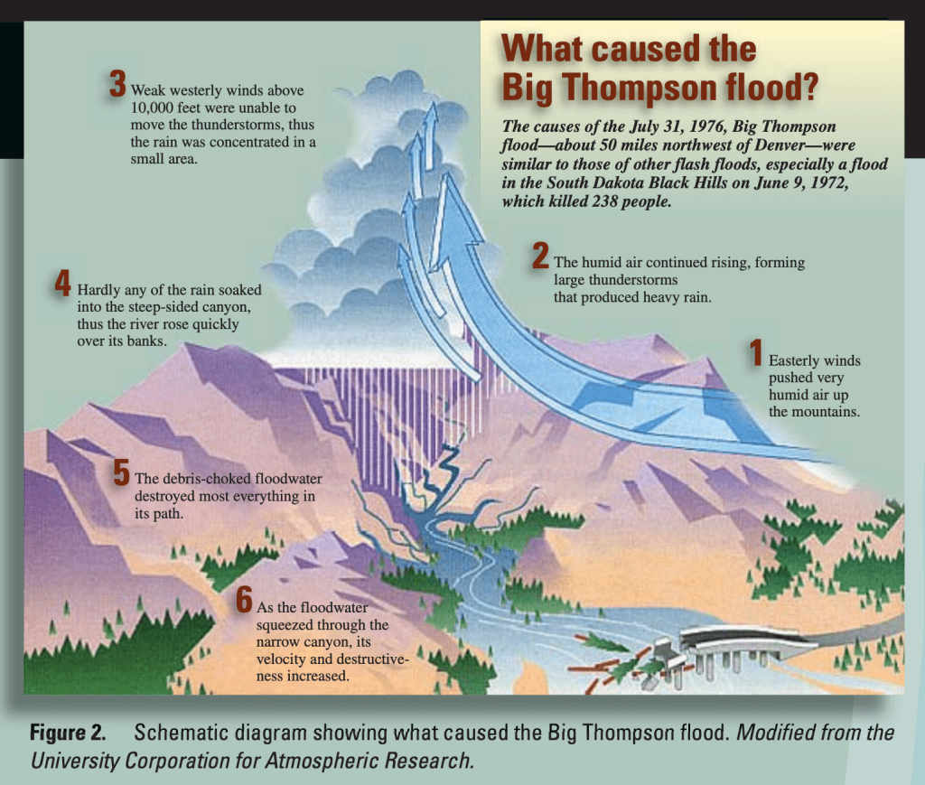 Schematic depiction of the processes that led to the 1976 Big Thompson Flood. From this 2006 USGS publication, which credits the University Corporation for Atmospheric Research for the original.