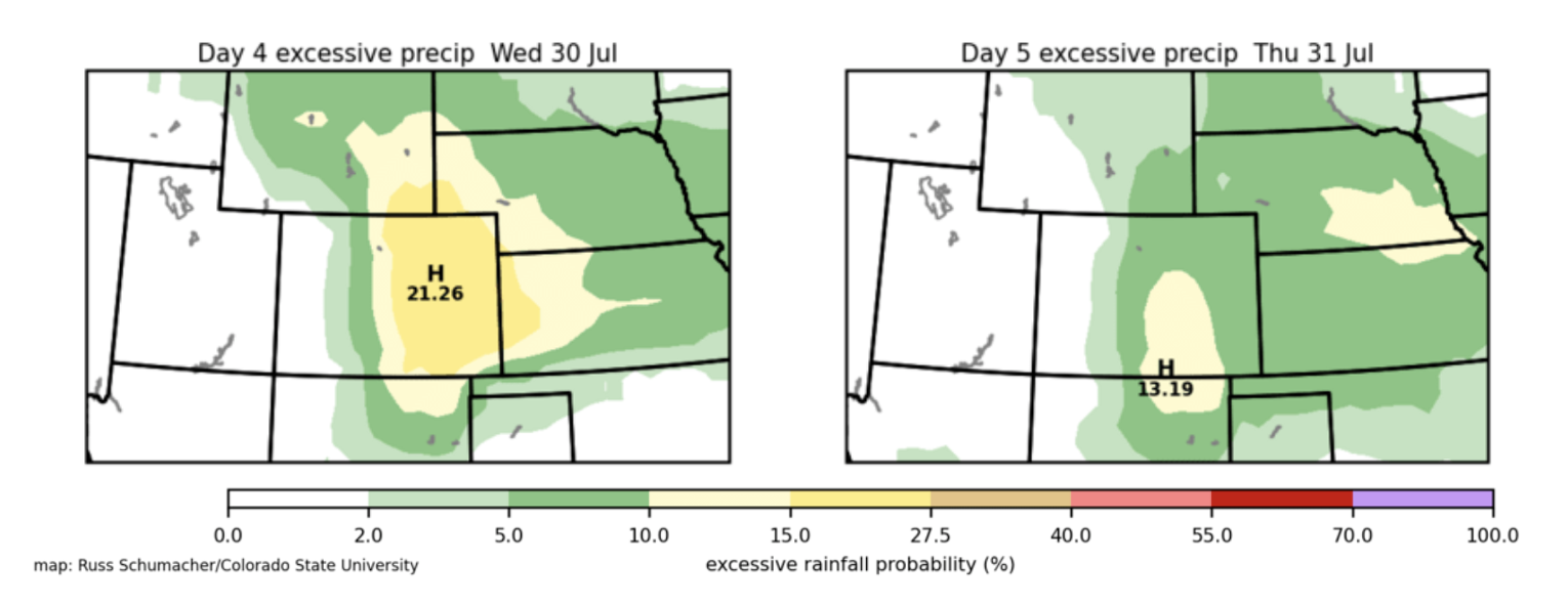 For the last several years, my research group has developedย tools that use machine learning to identify the probability of excessive rainfall and severe weather. These models have been consistently showing a strong signal for heavy rainfall along the Front Range on Wednesday, July 30th. In fact, for the current version of these models that have been running since 2020, this is the first time that both models (which were trained using slightly different definitions of โexcessive rainfallโ) have had probabilities greater than 20% four days in advance along the northern Front Range. Probabilities are relatively high for Thursday the 31st as well.