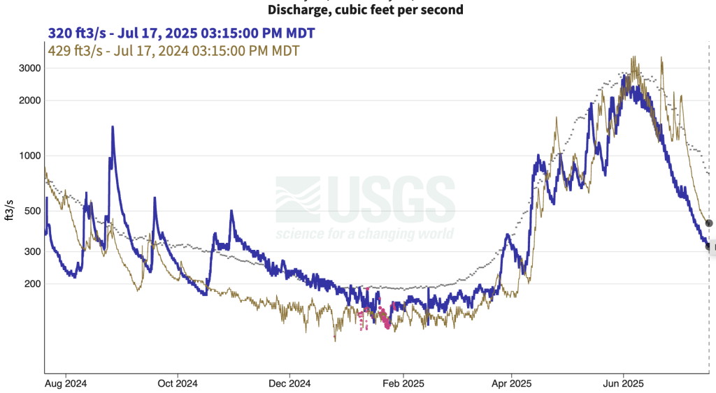 โDryโ in this case has a formal definition. The thinning ribbons of water you see in the picture above, taken mid-afternoon Monday (July 14, 2025) have to break. Itโs still a muddy mess; the riverโs subsurface manifestation, the shallow aquifer, still has water in it, the trees (look at their lovely green!) still have access to that part of the river. But if youโre a fish or a turtle, these are sad times.