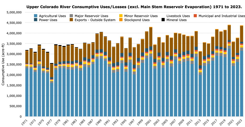 Snowmelt in 2025 was low, similar to what it was in 2012 and 2013; in early June, the Colorado Basin River Forecast Center predicted that this yearโs unregulated snowmelt inflow to Lake Powell will end up being 54% of the recent 30-yr average. In the 21st century, only 2002, 2018, and 2021 had lower inflows to Powell. Not surprisingly, the amount of water that accumulated in the Basinโs reservoirs during the 2025 snowmelt season was also unusually low. There are a few ways to consider the Basinโs reservoirs. We can consider every reservoir for which data are readily available[1]; we can consider the major reservoirs actively managed by Reclamation[2]; or, we can consider just Lake Powell and Lake Mead (hereafter, Powell+Mead). Considering only Lake Powell or only Lake Mead doesnโt tell us much, because all of the Rocky Mountain snowmelt is first stored in Lake Powell and subsequently transferred to Lake Mead. In 2025, the 46 Basin reservoirs gained only 0.55 million af (acre feet) of water, of which only 0.28 million af accumulated in the 12 federal reservoirs and only 0.11 million af accumulated in Powell+Mead. That is a very small amount, especially compared to 2023 and 2024 (Fig. 1). That accumulation is being quickly consumed. By 1 July 2025, all of the 2025 accumulation in Powell+Mead had been released downstream or evaporated.
