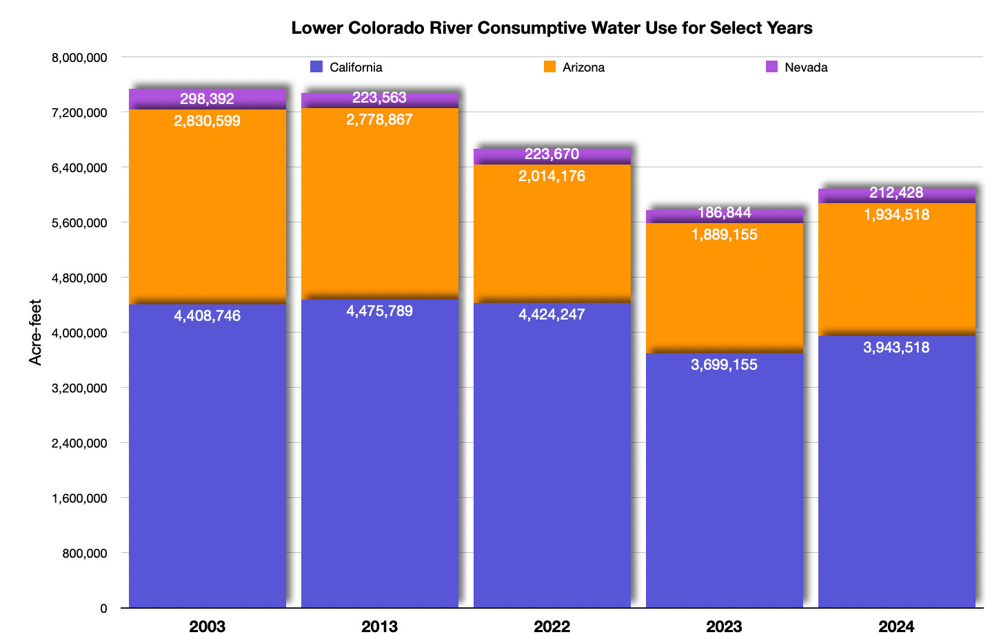 Water stored in the reservoirs of the Colorado River represents the account balance from which we draw water for use. The amount in the account is especially important during dry times when the demand by water users throughout the Basin exceeds income to the account, primarily snowmelt runoff, and is met by account withdrawals.