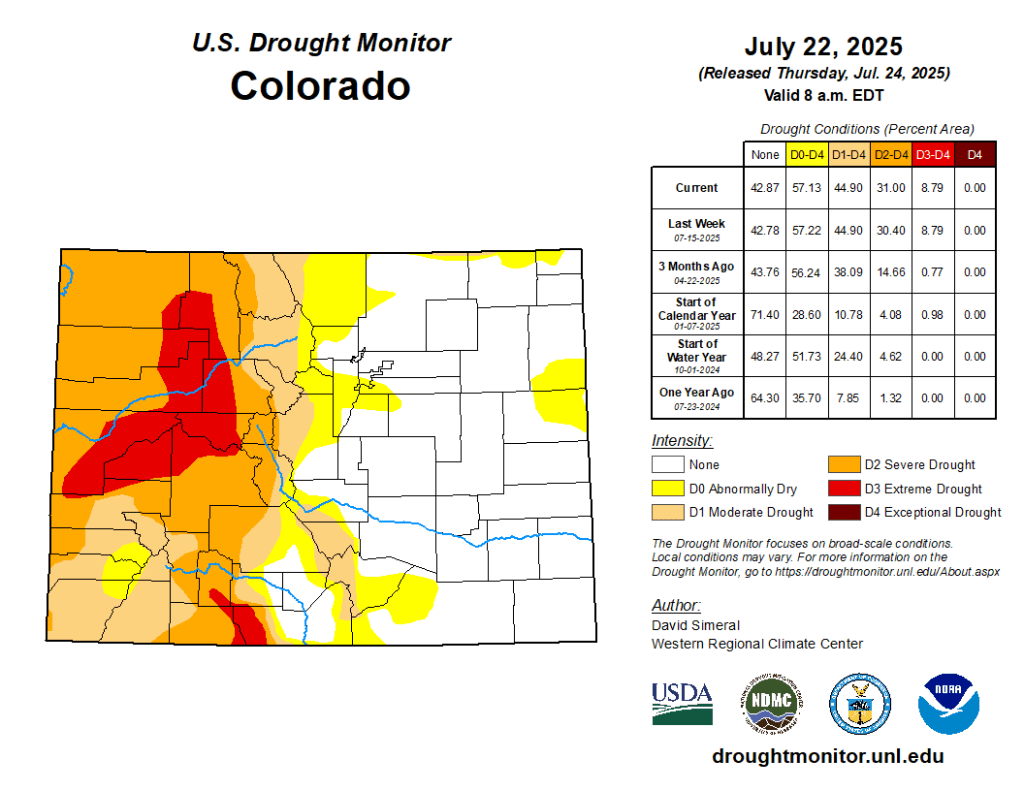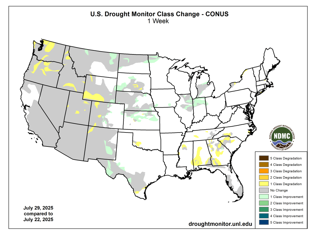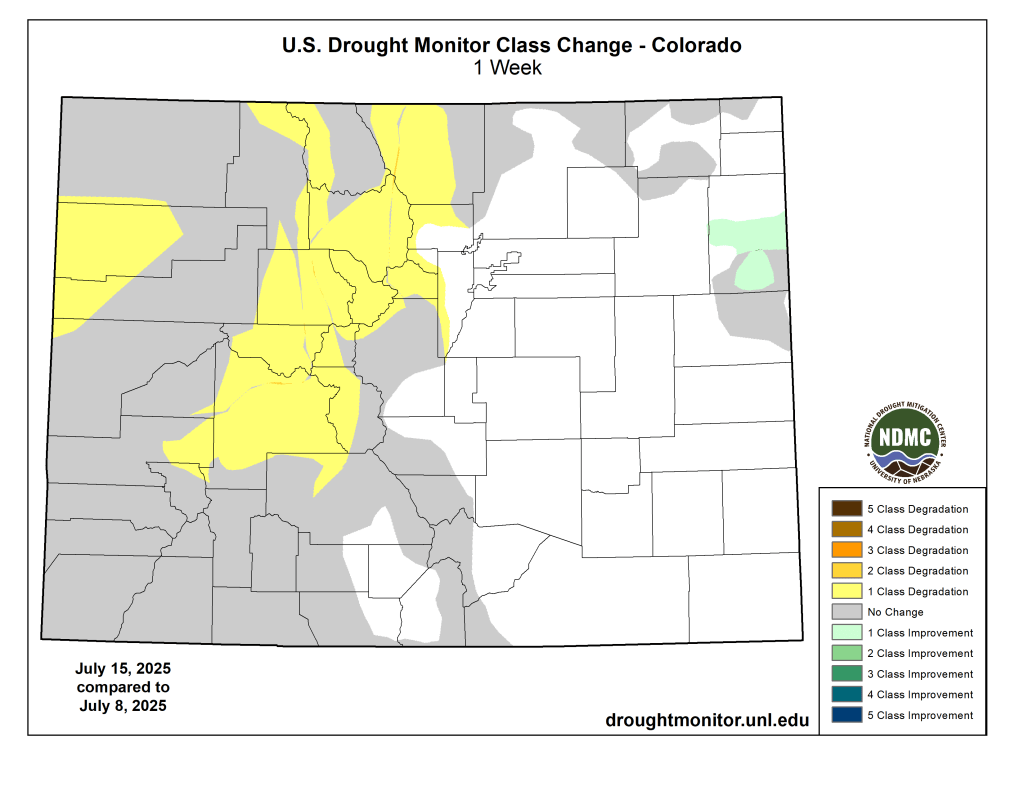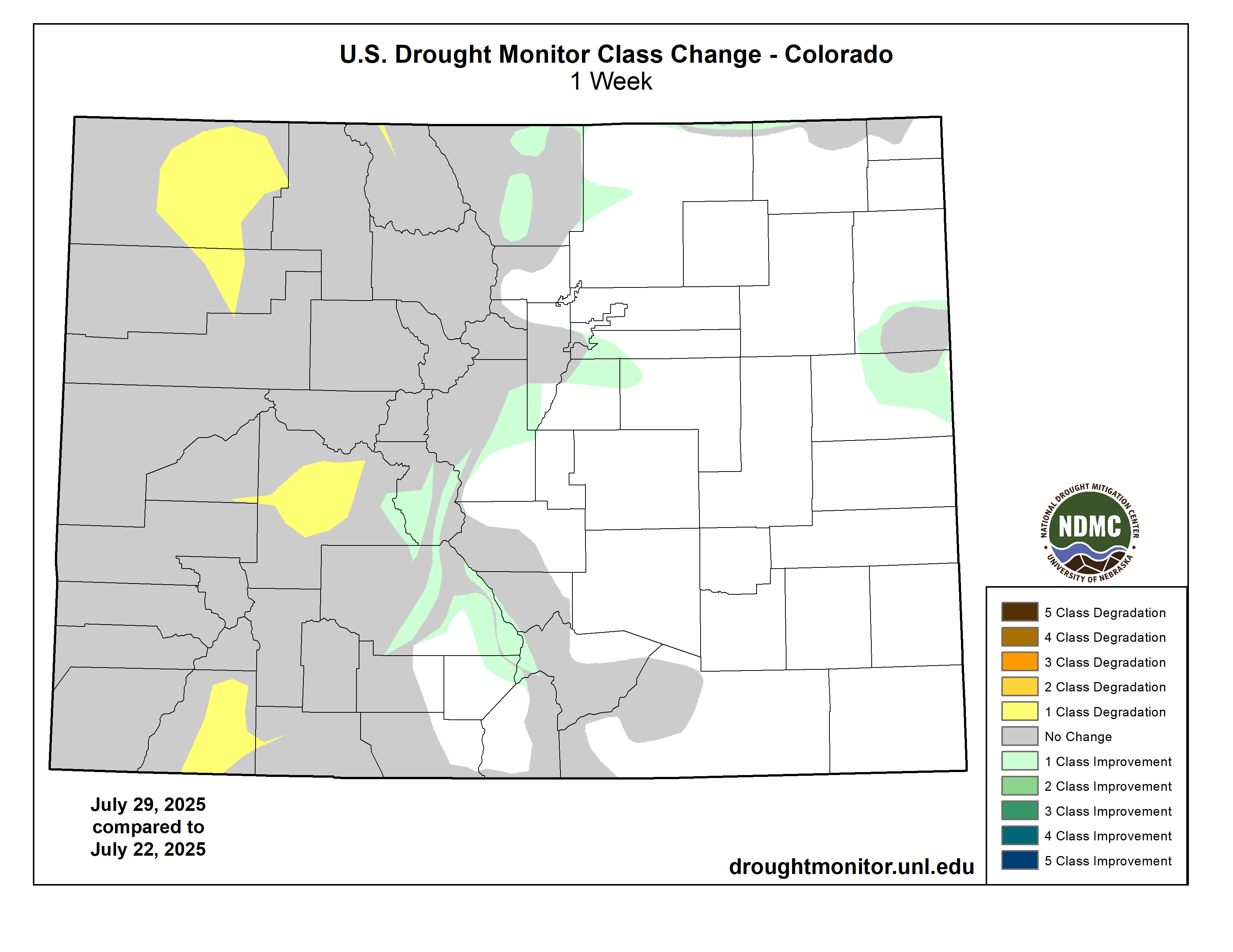 Colorado Drought Monitor one week change map ending July 29, 2025.