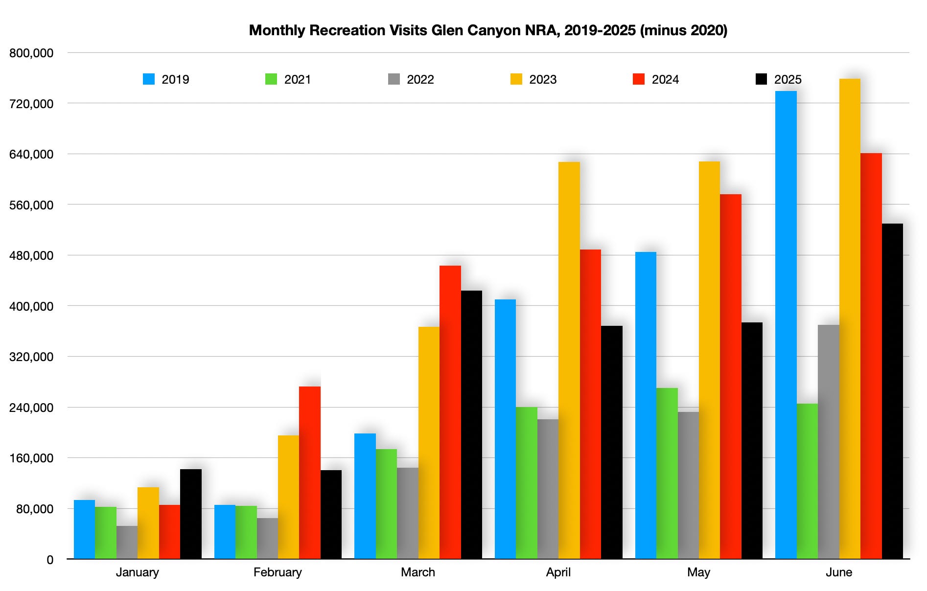 The implications for Lake Powell depend on whether Reclamation decides to emphasize water storage in Lake Powell or in Lake Mead, and whether water presently in Flaming Gorge reservoir will be released to supplement storage in Lake Powell. As of June 30, 32% of the reservoir storage in the Basin was in 42 reservoirs upstream from Powell, 30% was in Mead, and 29% was in Powell (Fig. 1). if past management practices prevail, storage upstream from Powell will be quickly reduced, and storage in Powell and Mead will be reduced more slowly. If Reclamation emphasizes storage in Lake Powell by reducing releases to Lake Mead through the Grand Canyon, hydropower production at Glen Canyon Dam will be maintained and the risk of entrainment of smallmouth bass through the turbines will be reduced. But this management approach will cause Lake Mead to fall more quickl, thereby reducing hydropower production at Hoover Dam and perhaps the quality of water withdrawn to southern Nevada. Water storage canโt be maximized in both reservoirs at the same time. Indeed, we are living in dry times!