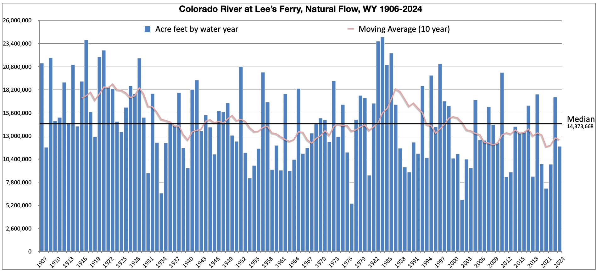 Udall/Overpeck 4-panel Figure Colorado River temperature/precipitation/natural flows with trend. Lake Mead and Lake Powell storage. Updated through Water Year 2024. Credit: Brad Udall
