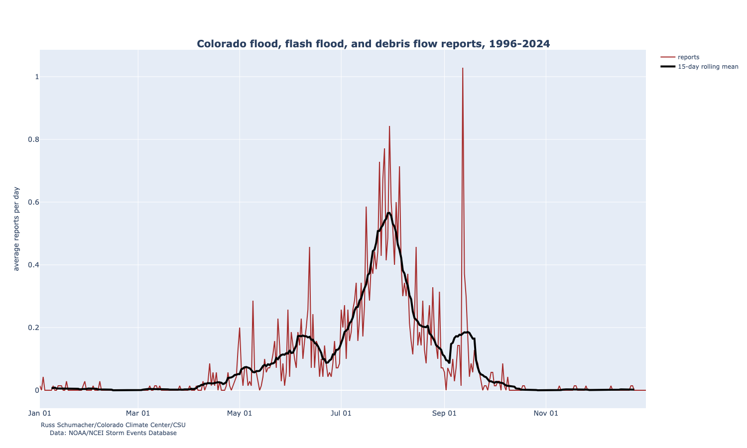 Average number of reports of flood, flash flood, or debris flow in Colorado from 1996-2024. The brown line shows the average number of reports on each calendar day; the thick black line is a 15-day rolling average. Data source: NOAA/NCEI Storm Events Database.