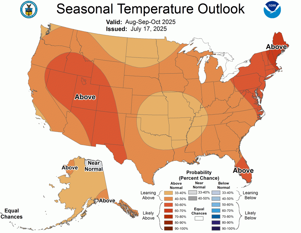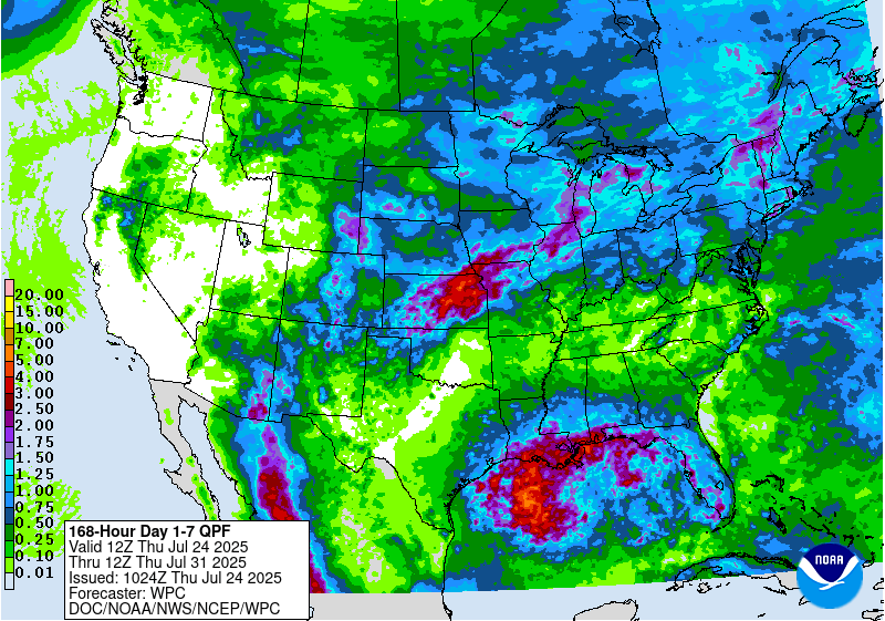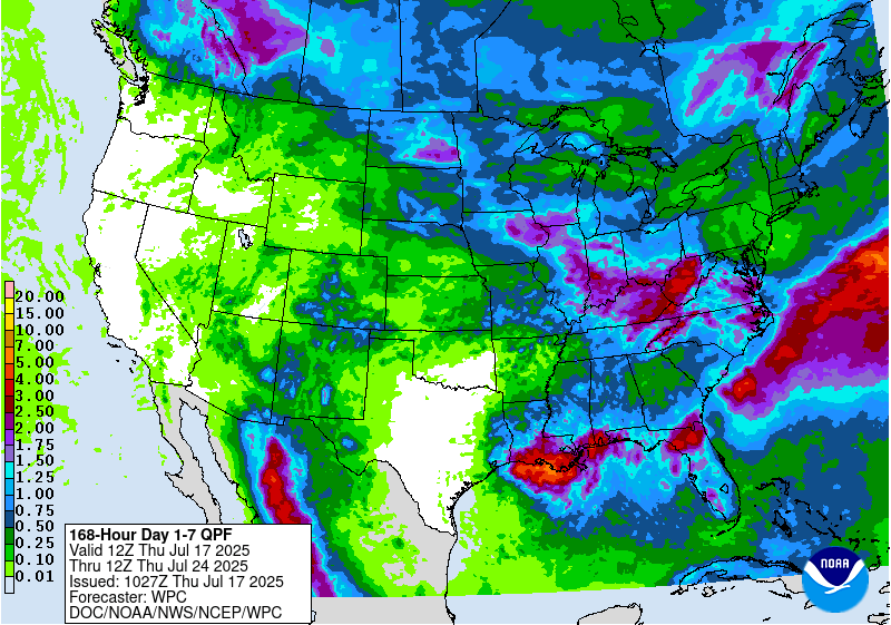 The NWS Weather Prediction Center (WPC) 7-Day Quantitative Precipitation Forecast (QPF) calls for generally dry conditions across much of the western U.S. except for some light shower activity (accumulations generally <1 inch) across areas of the Rockies (Idaho, Montana, Wyoming, Colorado) and mountain ranges of New Mexico. East of the Rockies, light-to-moderate accumulations (ranging from 1 to 4 inches) are expected across areas of the Plains states with the heaviest accumulations expected in western Oklahoma. In the lower Midwest, Mid-Atlantic, South (Gulf Coast areas), and portions of the Southeast, 1 to 5+ inch accumulations are forecast, with the heaviest accumulation expected along the coastal plains of Carolina and Georgia. The Climate Prediction Center (CPC) 6-10-day outlooks call for a moderate-to-high probability of above-normal temperatures across the Desert Southwest, southeastern portions of the Intermountain West, Plains, Midwest, New England, South, and southern portions of the Southeast region. In contrast, below-normal temperatures are forecast for areas of the West, including southern California, the Great Basin, and Pacific Northwest. In terms of precipitation, there is a low-to-moderate probability of above-normal precipitation across the Pacific Northwest, northern portions of the Intermountain West, northern Plains Midwest, Mid-Atlantic, and Southeast. Elsewhere, below-normal precipitation is expected across the southern half of the western U.S., southern Plains, and Texas.