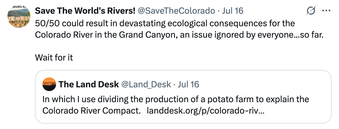 Before I continue with my rant, Iโd just like to encourage Yglesias to do a little more thinking about water scarcity before writing about it. Oh, and also, maybe consider spending a little bit of time in the water-starved West before committing punditry about it. (This is the same guy who tweeted that Sen. Mike Leeโs proposal to sell off public land was โpretty reasonableโ and an โokay idea on the meritsโ).