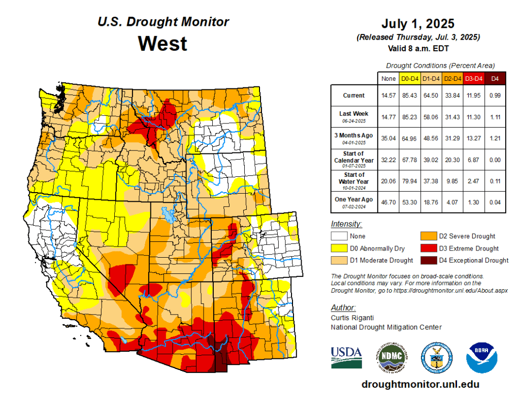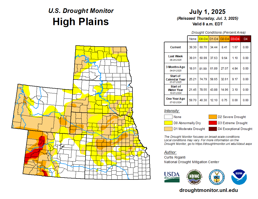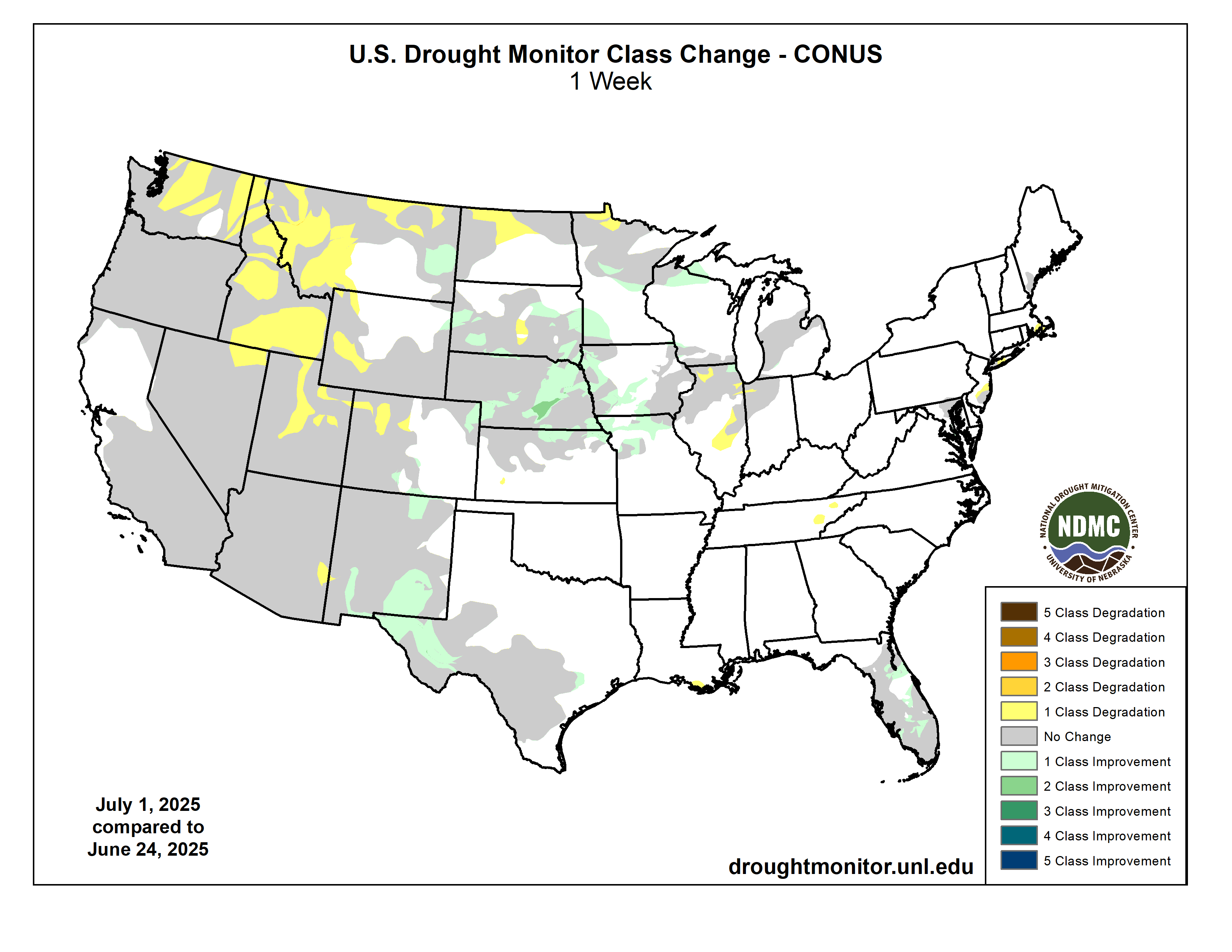 Very heavy rain fell across parts of southwest and central Nebraska, which extended into portions of northern Kansas (north of Interstate 70) and portions of west-central and eastern South Dakota. Significant flash flooding occurred from rain amounts locally exceeding 8 inches in Grand Island, Nebraska, while very heavy rain, locally in excess of 5 inches, fell in parts of eastern South Dakota, where significant tornadoes also occurred on June 28. Heavier rain amounts fell in parts of south-central and northeast Colorado as well, though most of the heavier totals were in the 1-3 inch range. Primarily dry weather occurred west of the Continental Divide in Colorado and Wyoming. Temperatures across the region were mostly near normal to 2-4 degrees above normal, though parts of the eastern Dakotas were a few degrees cooler than normal. In areas that received heavy rain, soil moisture and precipitation deficits were alleviated and widespread improvements to ongoing drought or abnormal dryness occurred, including a two-category improvement in central Nebraska where some of the week’s heaviest rains fell. Meanwhile, degradations occurred in northwest Colorado and western Wyoming, where soil moisture and streamflow deficits mounted amid growing precipitation deficits…