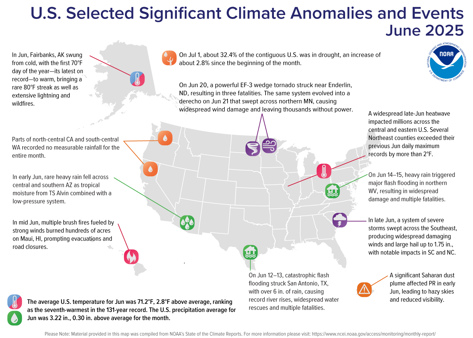 For more detailed climate information, check out our comprehensive June 2025 U.S. Climate Report scheduled for release on July 14, 2025. For additional information on the statistics provided here, visit the Climate at a Glance and National Maps webpages.