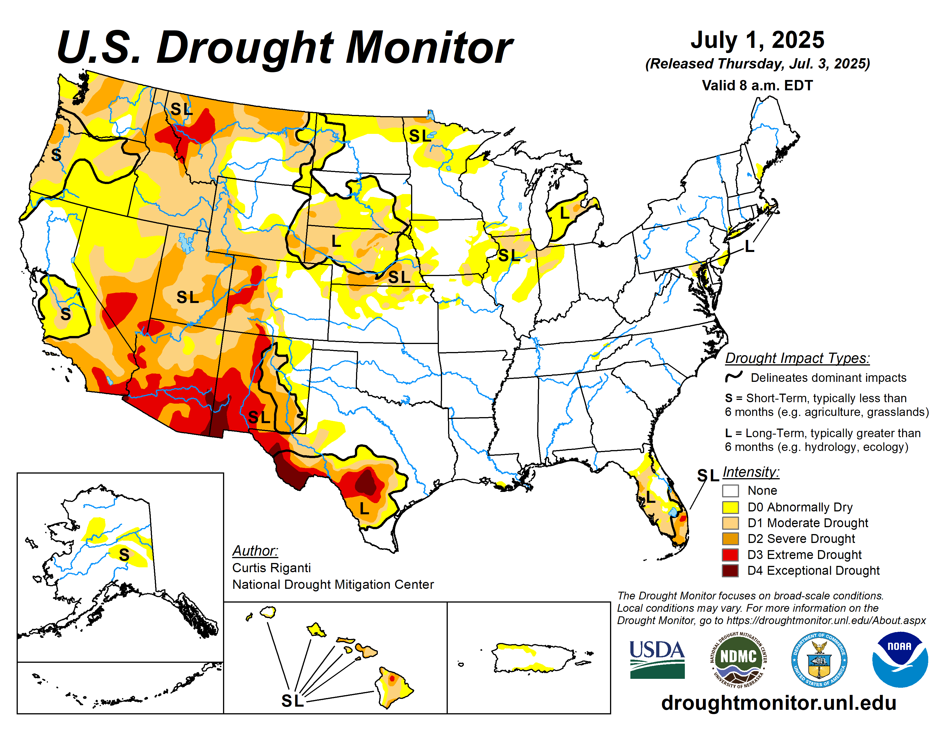 According to the July 1 U.S. Drought Monitor report, about 32.4% of the contiguous U.S. was in drought, an increase of approximately 2.8% since the beginning of the month. Drought developed or intensified across much of the Northwest through the Rocky Mountains and in small areas of the Alaskan interior. Conversely, drought contracted or was reduced in intensity across parts of the Southwest and southern Texas, the central and northern Plains, the upper Mississippi Valley and parts of Florida.
