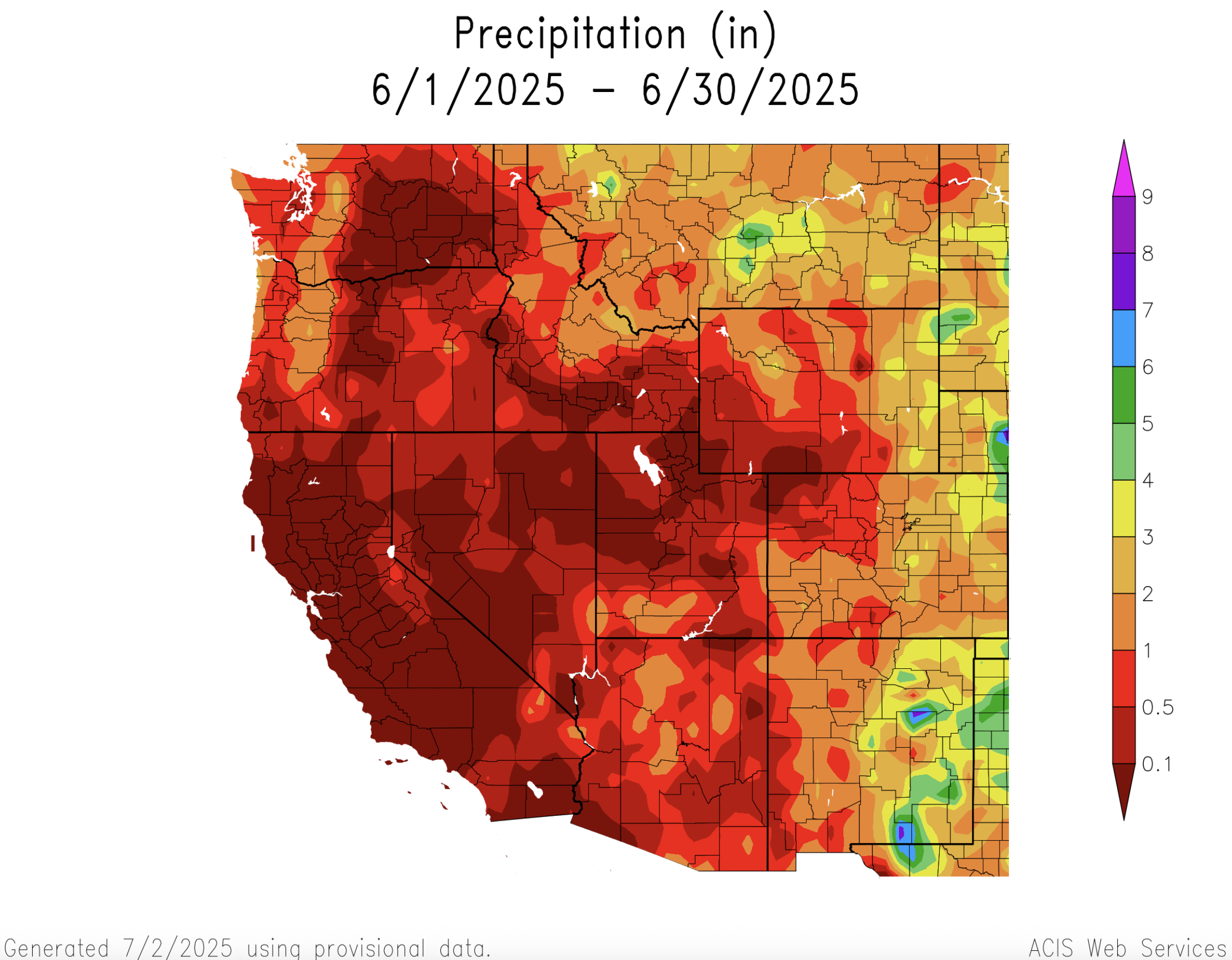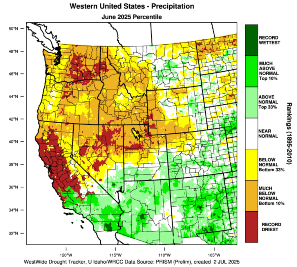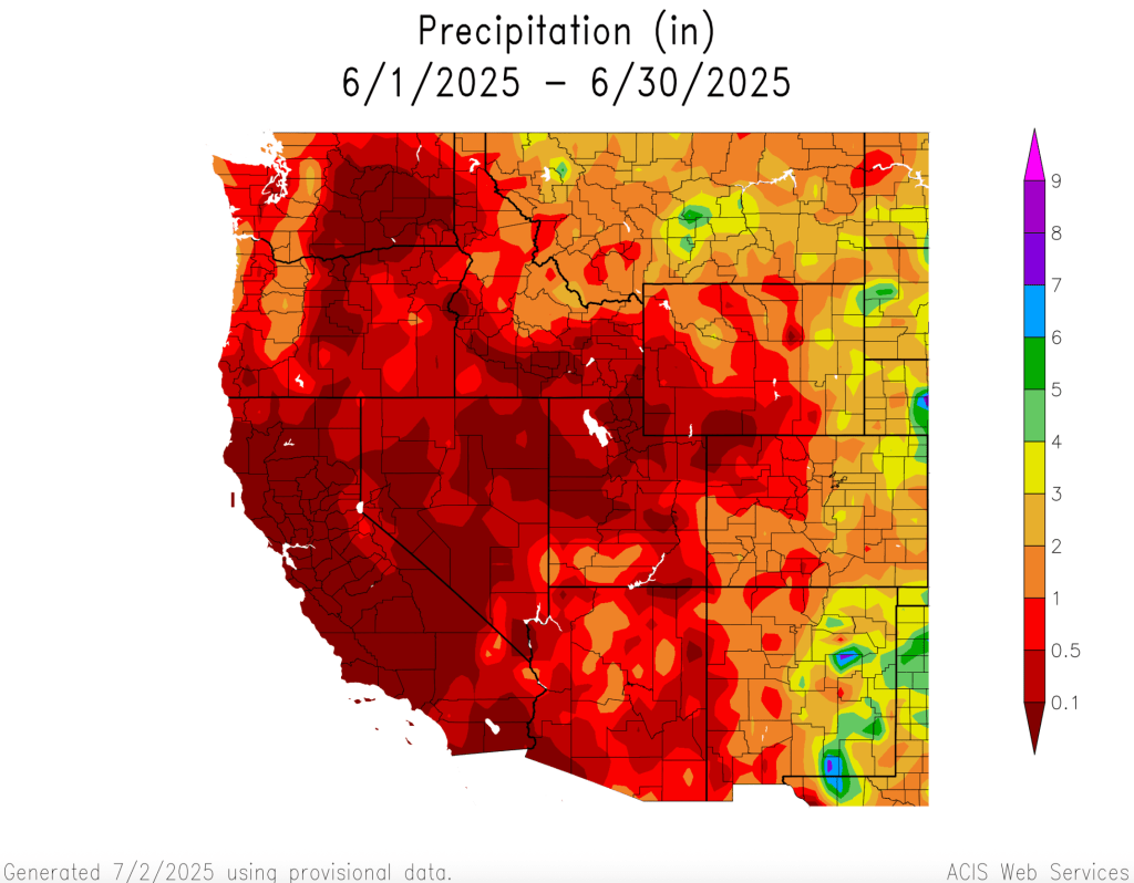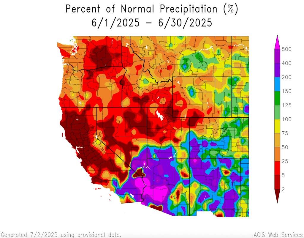 Above average June precipitation was observed in southern Utah, eastern Wyoming and the majority of Colorado. Much of Utah and Wyoming and northwestern Colorado received below average precipitation during June. Parts of southern Colorado and southern Utah received twice the average June rainfall while some locations in northern Utah and southwestern Wyoming observed record low June rainfall totals. Average June rainfall is typically low in the Intermountain West and areas of southern Utah and southwestern Colorado with 150-400% of average June rainfall observed total rainfall amounts of 1-2 inches.