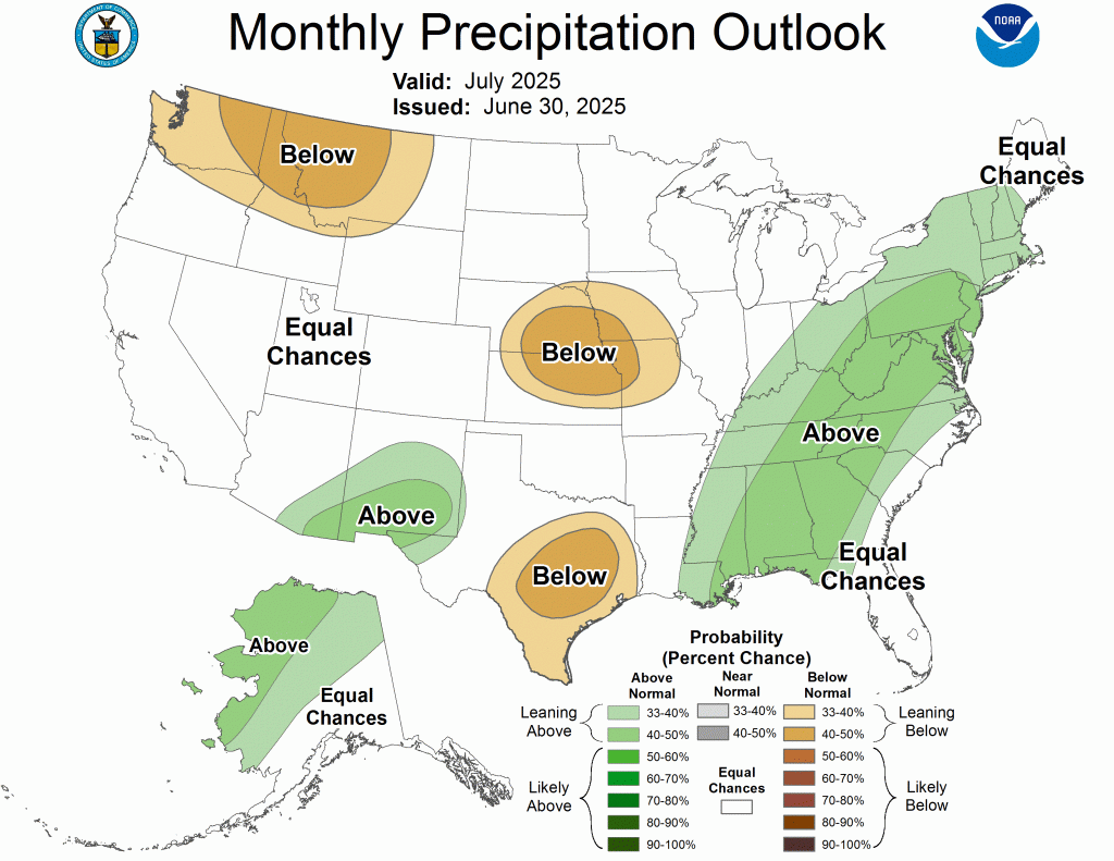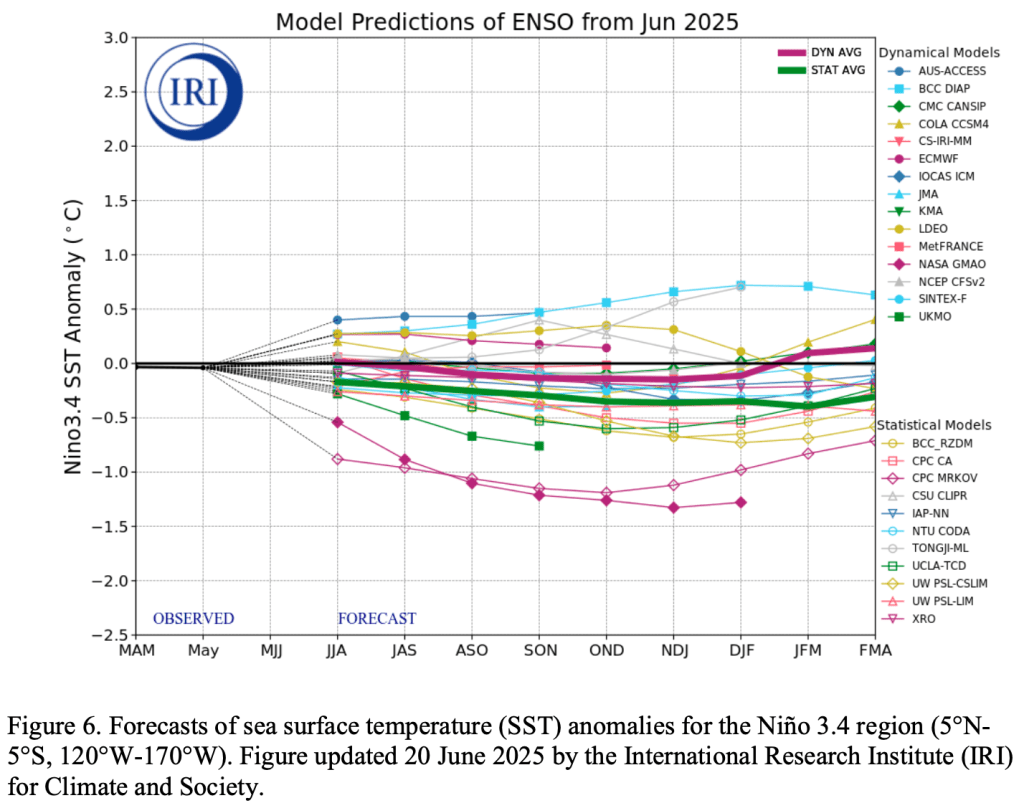 The IRI predictions indicate ENSO-neutral is most likely through the Northern Hemisphere winter 2025-26. In contrast, the North American Multi-Model Ensemble favors the onset of La Niña conditions during the Northern Hemisphere fall, though lasting a shorter duration than NOAA’s requirement of five consecutive overlapping 3-month seasons. While the subsurface equatorial Pacific remains above average, easterly trade winds are predicted to strengthen in the coming month, which could portend cooler conditions. In summary, ENSO-neutral is most likely through the late Northern Hemisphere summer 2025 (56% chance in August-October). Thereafter, chances of La Niña conditions increase into the fall and winter 2025-26, but remain nearly equal to ENSO-neutral.