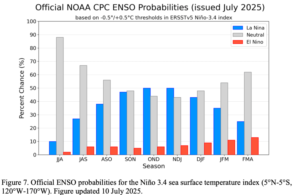 2025 (56% chance in August-October). Thereafter, chances of La Niña conditions increaseinto the fall and winter 2025-26, but remain comparable to ENSO-neutral.