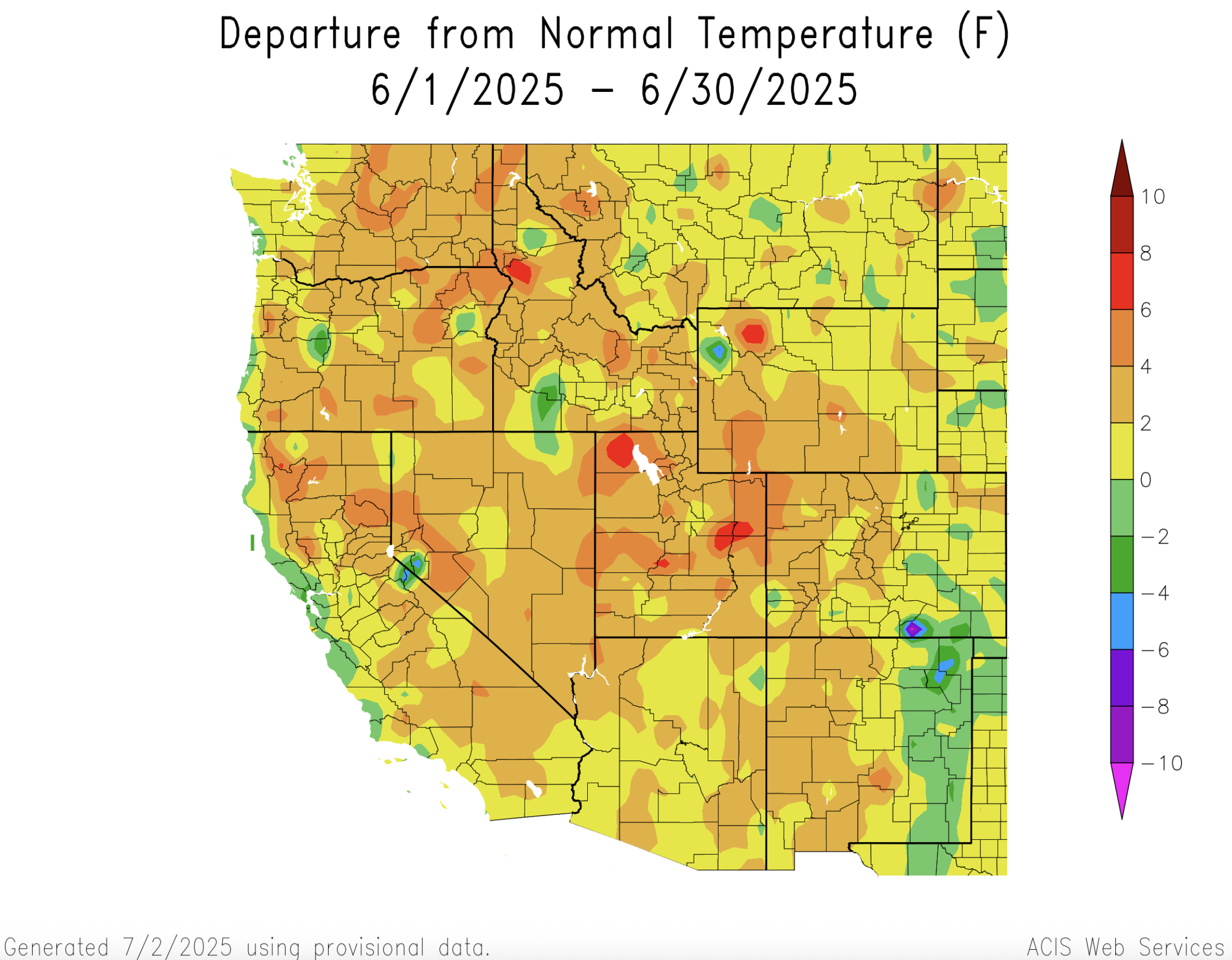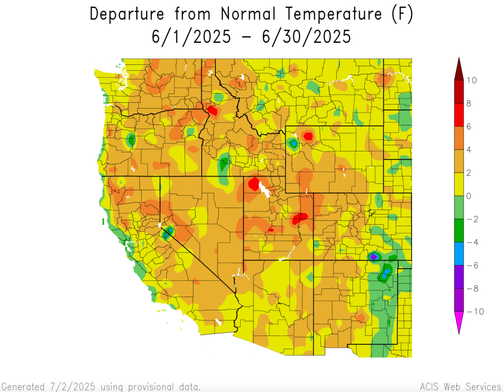 June temperatures were above average for much of Colorado, Utah and Wyoming, except for eastern Colorado and Wyoming where temperatures were up to two degrees below average. The warmest temperatures were observed in Utah, northwestern Colorado, and western Wyoming where June average temperatures were in the top 10% of all observations since 1895.