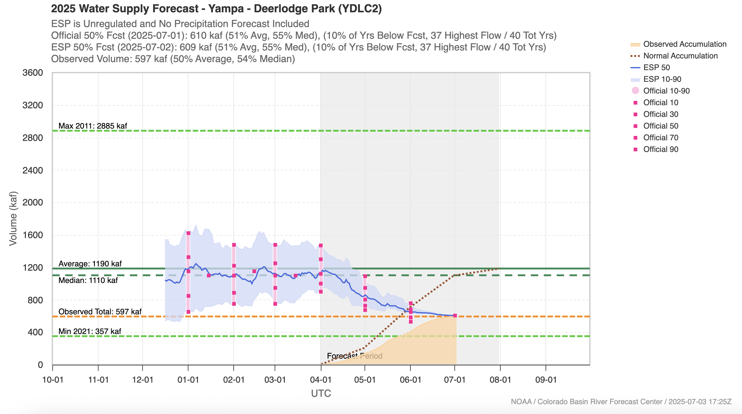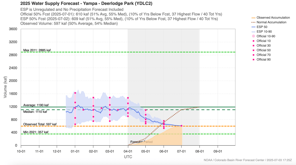 As of July 1st, snowpack was melted out across the region and snowmelt occurred earlier than average across all basins except the Tongue River Basin in northern Wyoming. In Colorado, snowmelt occurred only a few days early in the Arkansas and South Platte River Basins, around a week early in the Animas, Colorado Headwaters, Dolores, Gunnison and Yampa River Basins, two weeks early in the San Juan River Basin and nearly four weeks early in the Rio Grande River Basin. In Utah, snowmelt was only a few days early in the Bear River Basin, 1-2 weeks early in the northern Utah, Price, Sevier and Virgin River Basins and 24 days early in the Escalante River Basin. In Wyoming, snowmelt occurred earlier than average in all basins except the Tongue River Basin, with the Belle Fouche, Cheyenne and Snake River Basins melting out 2-3 weeks early.