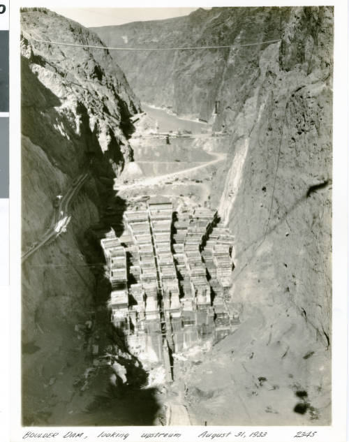 Looking upstream at the Boulder Dam (now called Hoover Dam) under construction. “Boulder Dam, looking upstream August 31, 1933 2345” is written at the bottom of the photo. Via UNLV