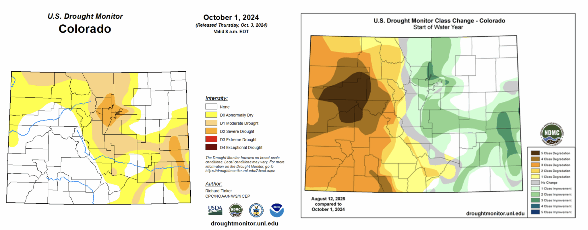 With only about a month and a half left in Water Year 2025, it is worth looking back at how the drought landscape has changed in Colorado since last October. Water years run from October 1 to September 30 and are designed to capture the movement of water from the time that streamflows are generally at their minimum (in the fall), through the build up of the water supply as snowpack during the winter, to the annual runoff in the spring and summer. Keeping track of drought and precipitation over the course of a water year is helpful for tracking and managing water resources.