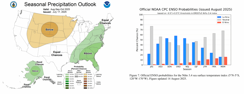 Looking even further ahead, the Climate Prediction Center 3-month outlook (August-October) that was released in mid-July does not inspire much optimism for drought relief as we head into fall. Their predictions call for elevated chances of below-normal precipitation across most of Colorado. Additionally, it is becoming increasingly likely that La Niña conditions will develop in late fall to early winter. While there is some evidence that La Niña favors wetter conditions over parts of north and central Colorado during the winter months, it favors overall drier conditions statewide, especially during the fall (though the correlations between ENSO phase and precipitation are relatively weak compared to other locations).